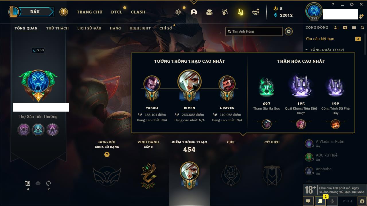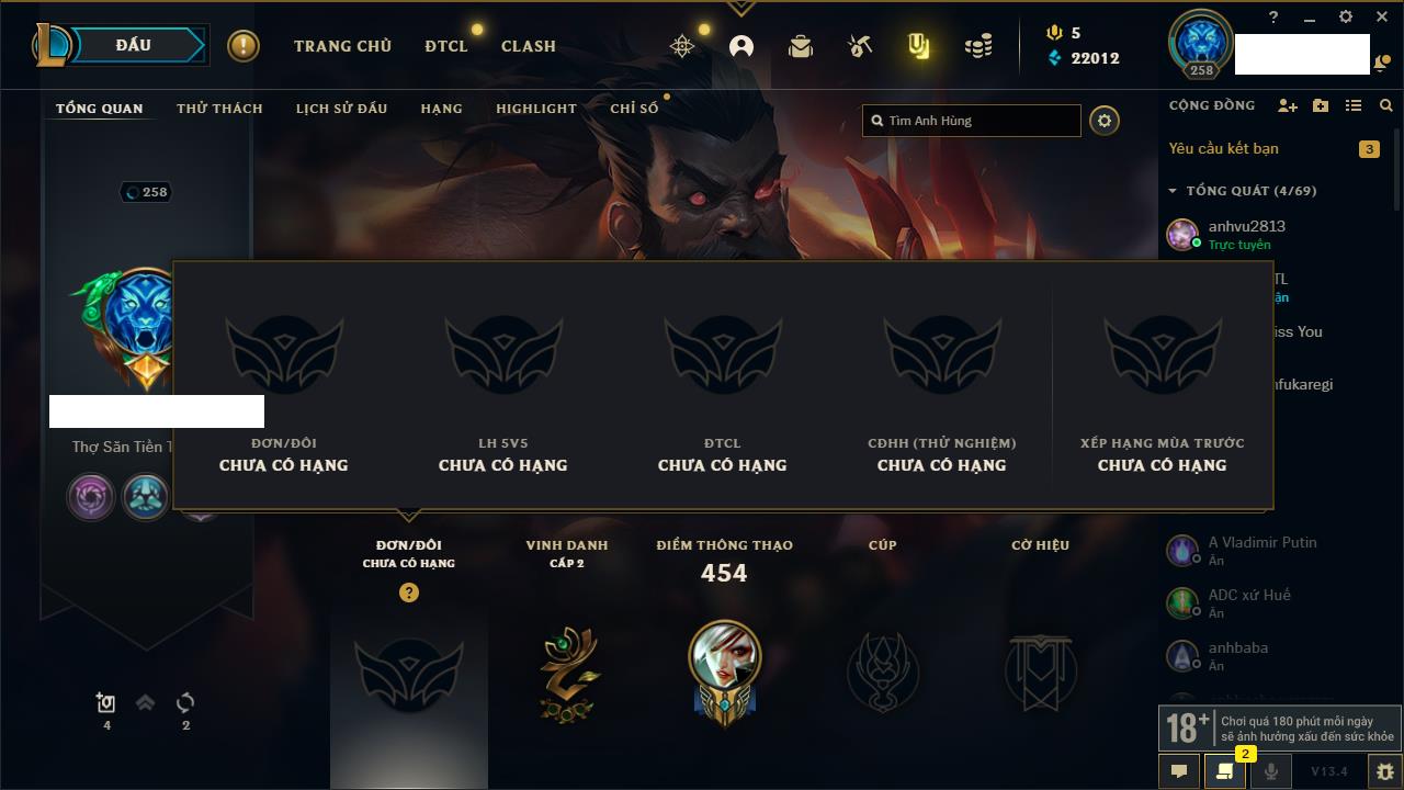 Rank Đơn: Vàng IVKhung: VàngTướng: 146 - Còn 89110 THXTrang Phục: 63Rank ĐTCL: Vàng IIILinh Thú: 41