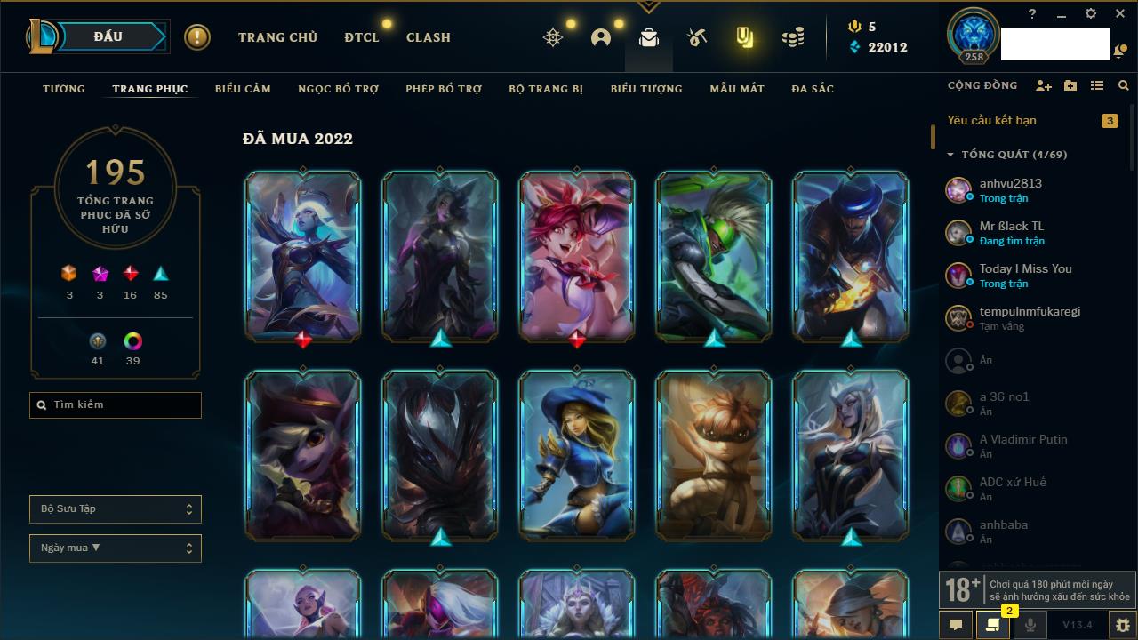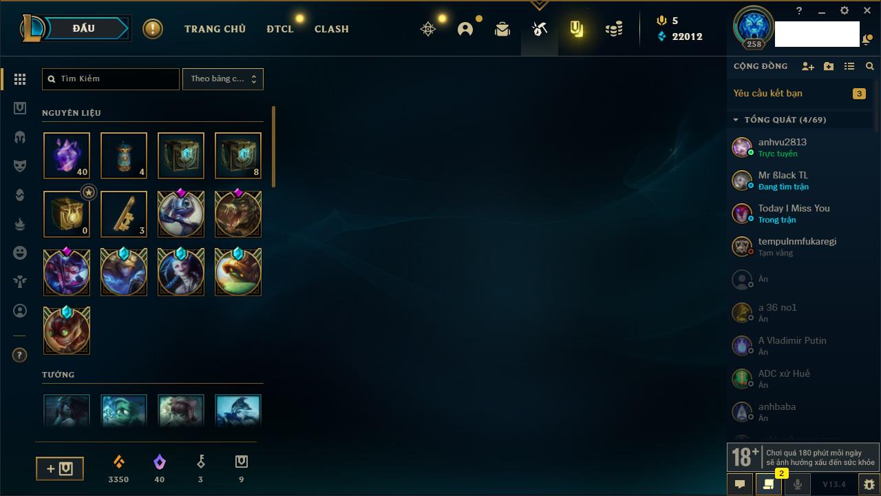 Rank Đơn: Vàng IIIKhung: VàngTướng: 170 - Còn 33222 THXTrang Phục: 136Rank ĐTCL: Chưa RankLinh Thú: 40