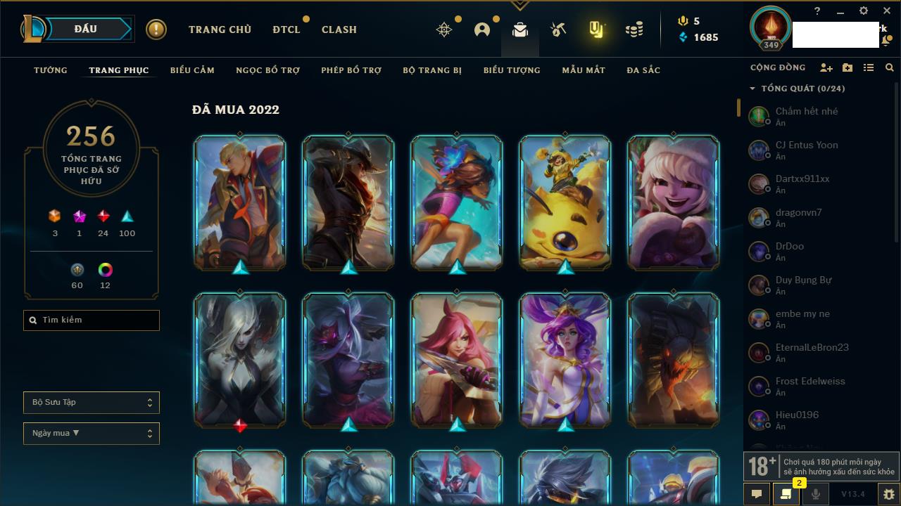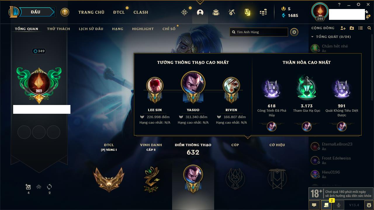 Rank Đơn: Đồng IKhung: ĐồngTướng: 168 - Còn 11447 THXTrang Phục: 245Rank ĐTCL: Chưa RankLinh Thú: 53