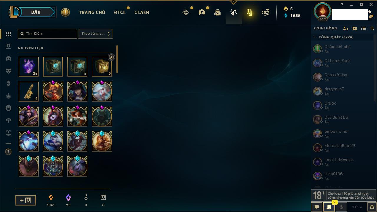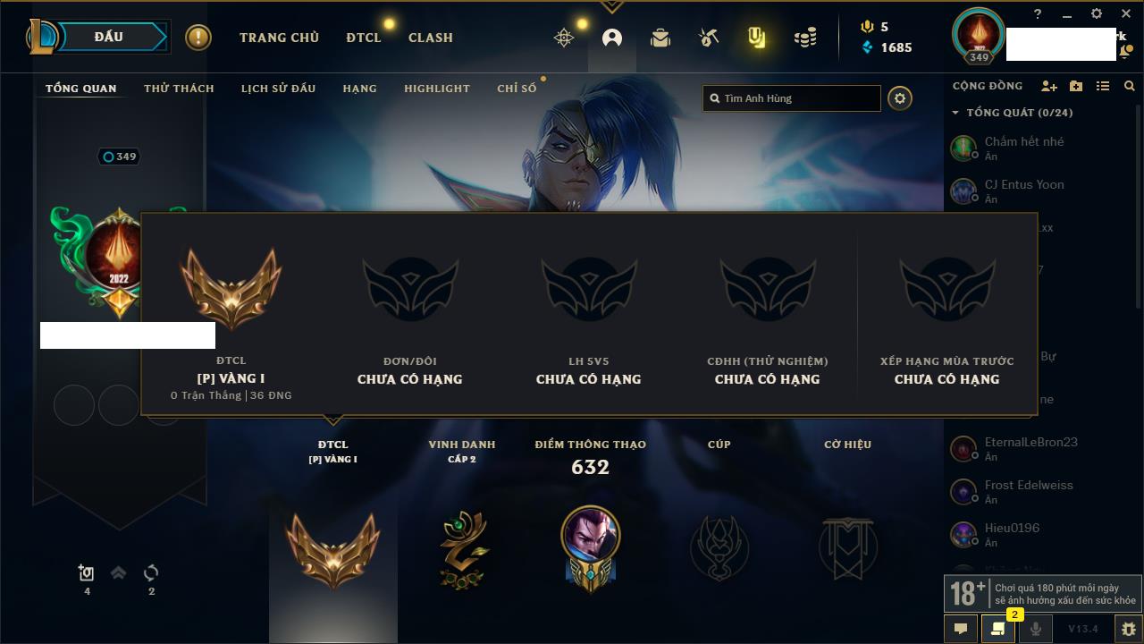 Rank Đơn: Vàng IIIKhung: BạcTướng: 171 - Còn 101359 THXTrang Phục: 88Rank ĐTCL: Kim Cương IVLinh Thú: 200