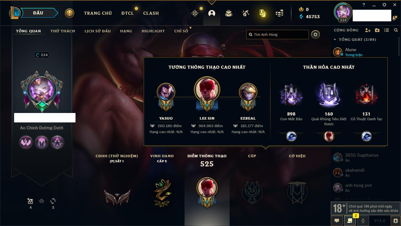 Rank Đơn: Chưa RankKhung: BạcTướng: 141 - Còn 299 THXTrang Phục: 101Rank ĐTCL: Chưa RankLinh Thú: 84