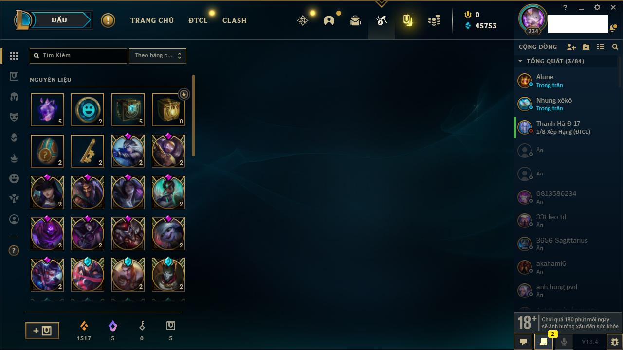 Rank Đơn: Chưa RankKhung: Chưa có khungTướng: 162 - Còn 23234 THXTrang Phục: 150Rank ĐTCL: Chưa RankLinh Thú: 42