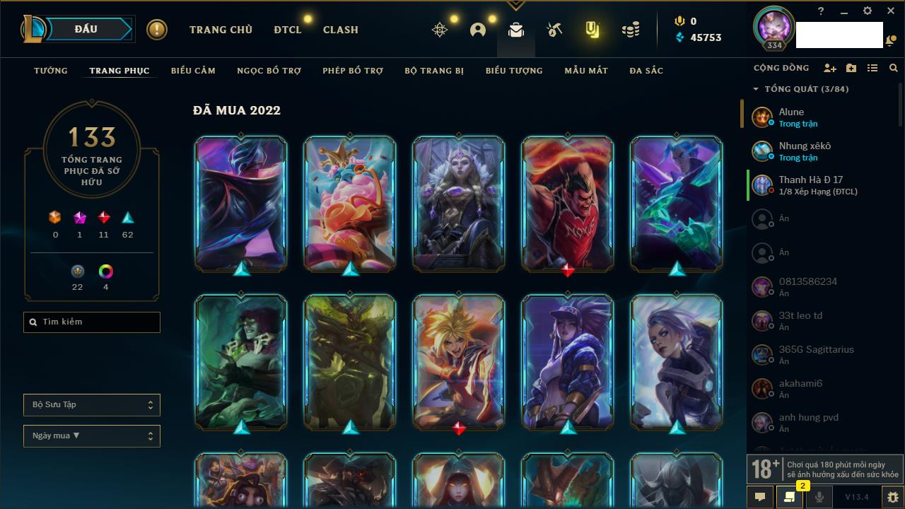 Rank Đơn: Chưa RankKhung: Chưa có khungTướng: 154 - Còn 18477 THXTrang Phục: 127Rank ĐTCL: Vàng ILinh Thú: 183