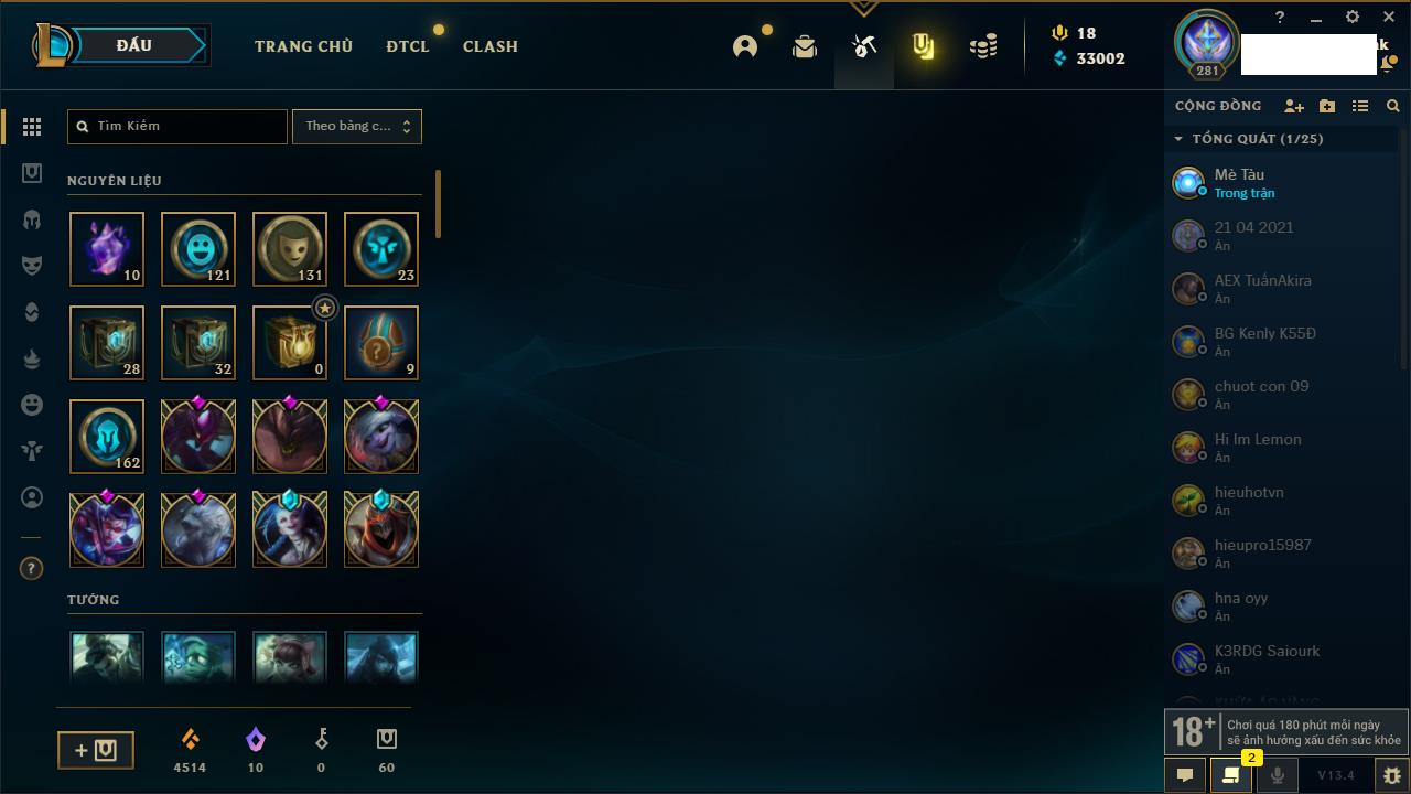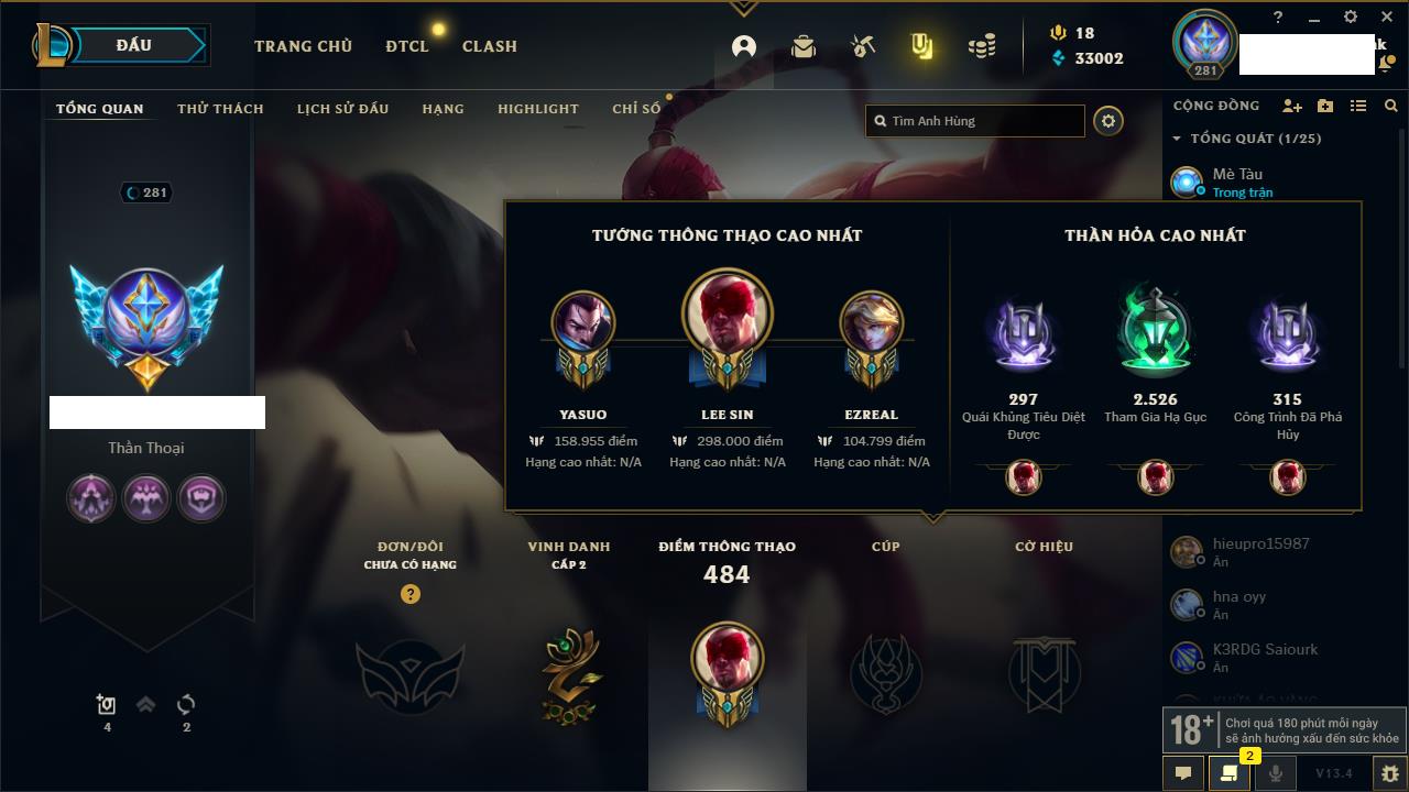 Rank Đơn: Chưa RankKhung: Chưa có khungTướng: 157 - Còn 6783 THXTrang Phục: 50Rank ĐTCL: Chưa RankLinh Thú: 37