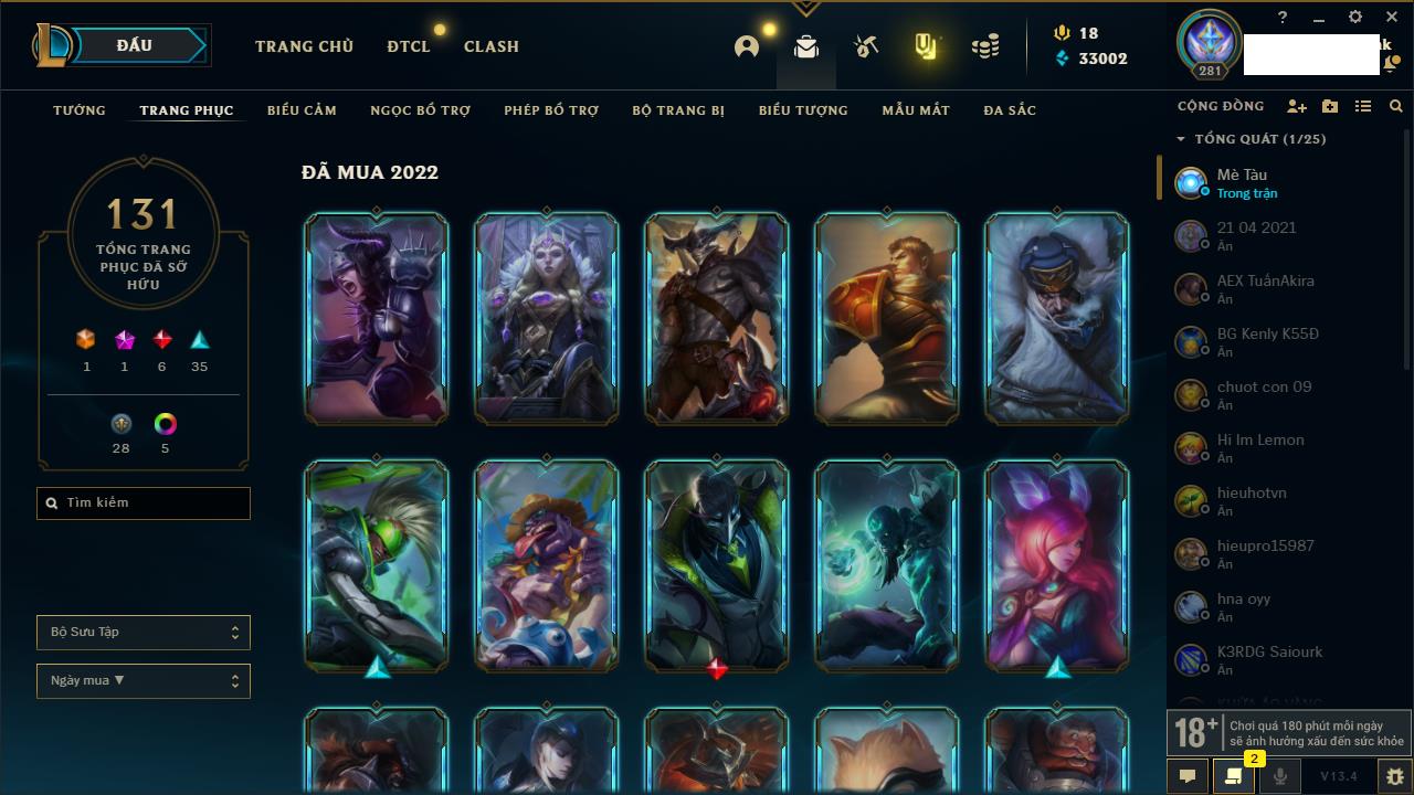 Rank Đơn: Vàng IIIKhung: VàngTướng: 170 - Còn 33222 THXTrang Phục: 136Rank ĐTCL: Chưa RankLinh Thú: 40