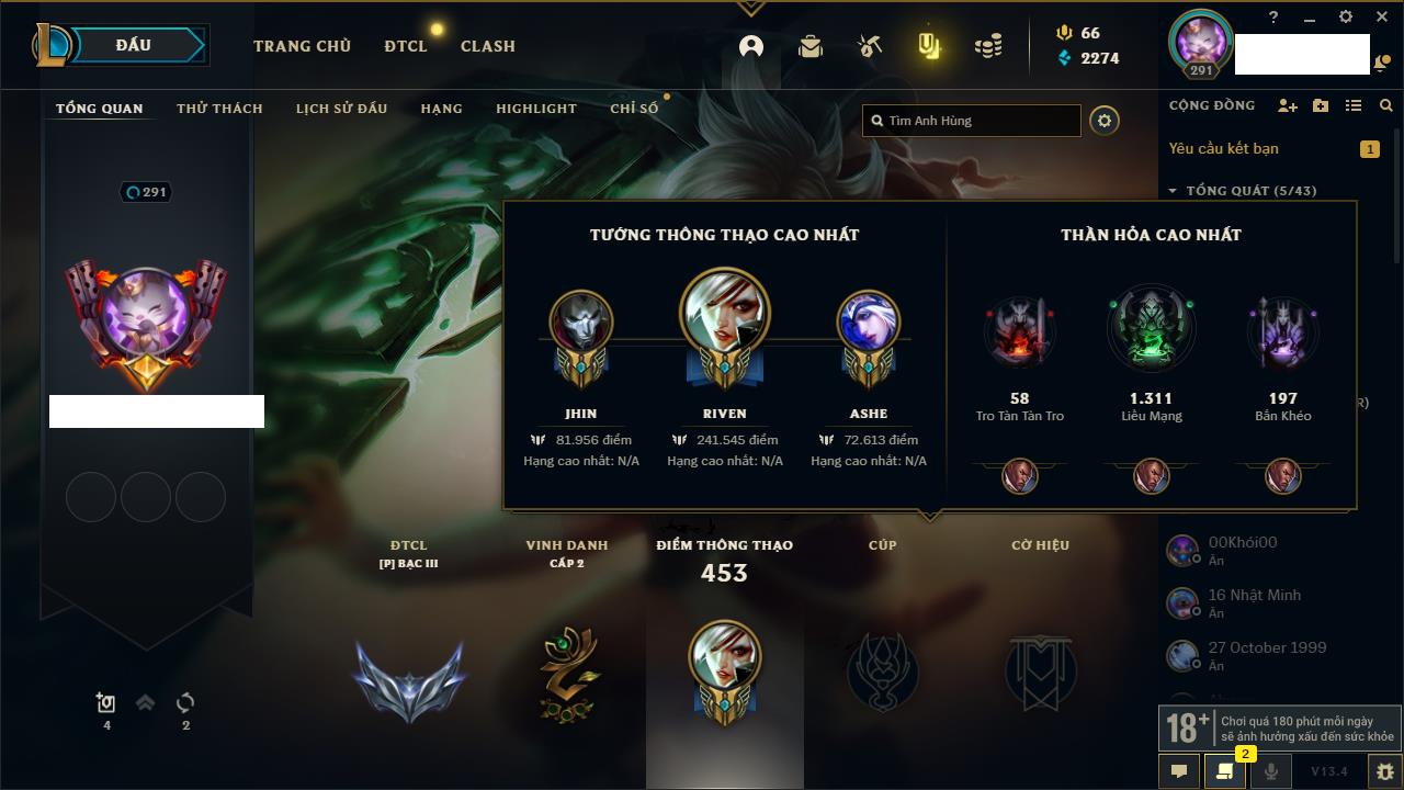 Rank Đơn: Chưa RankKhung: Chưa có khungTướng: 157 - Còn 6783 THXTrang Phục: 50Rank ĐTCL: Chưa RankLinh Thú: 37