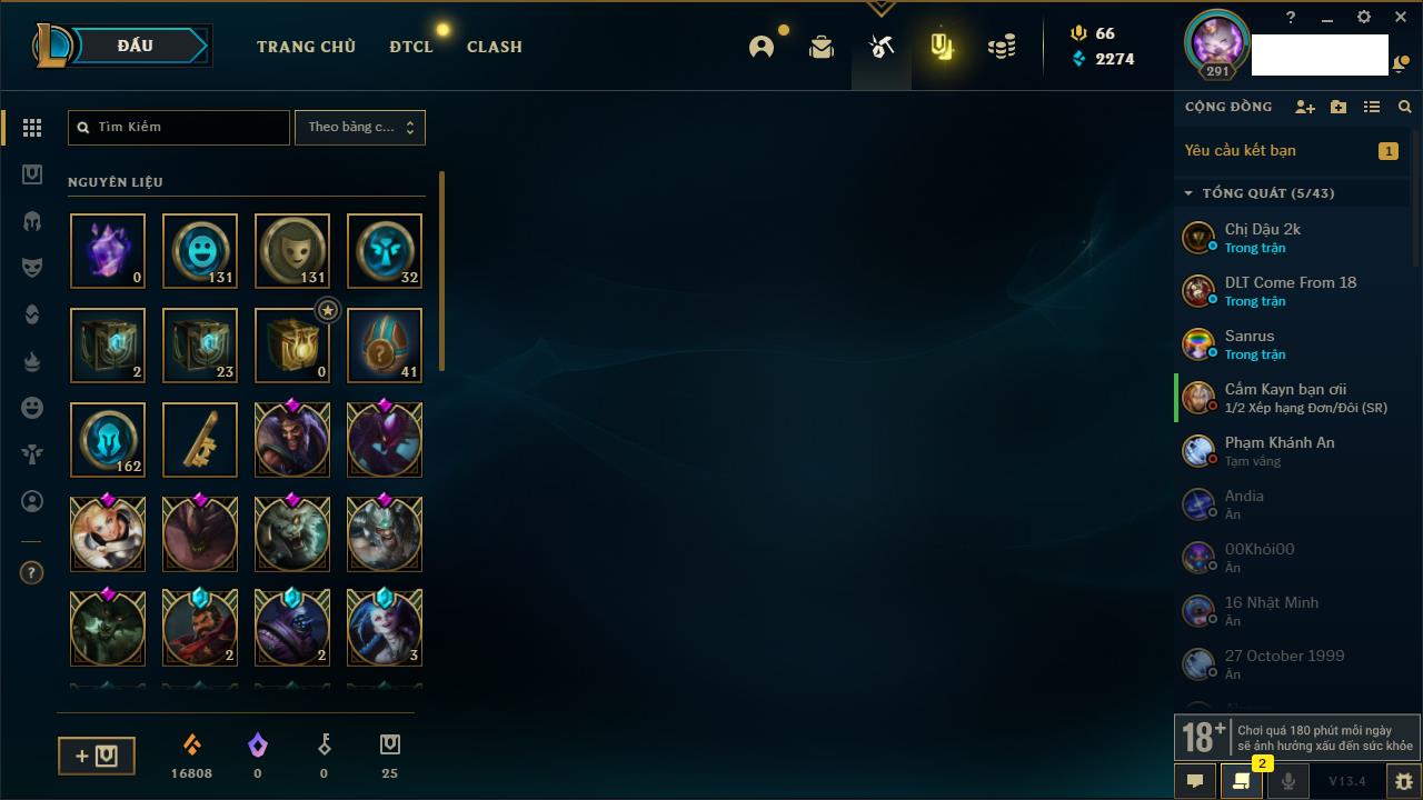 Rank Đơn: Đồng IIKhung: Chưa có khungTướng: 170 - Còn 56487 THXTrang Phục: 90Rank ĐTCL: Chưa RankLinh Thú: 129