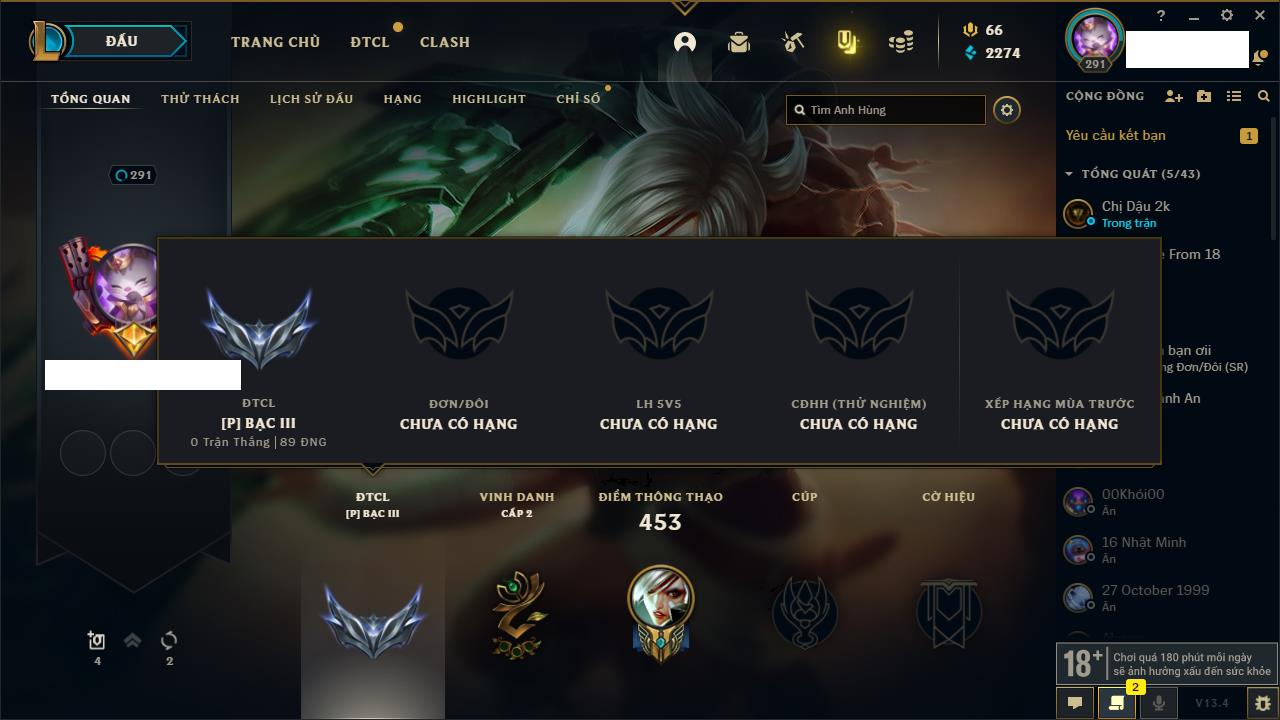 Rank Đơn: Vàng IVKhung: VàngTướng: 146 - Còn 89110 THXTrang Phục: 63Rank ĐTCL: Vàng IIILinh Thú: 41