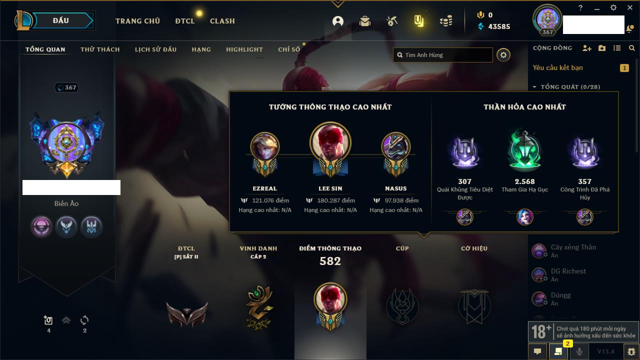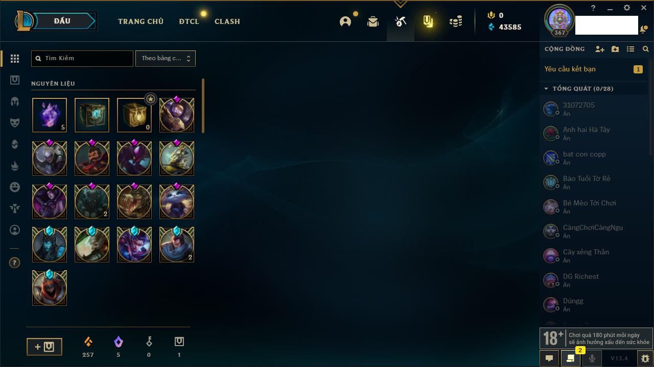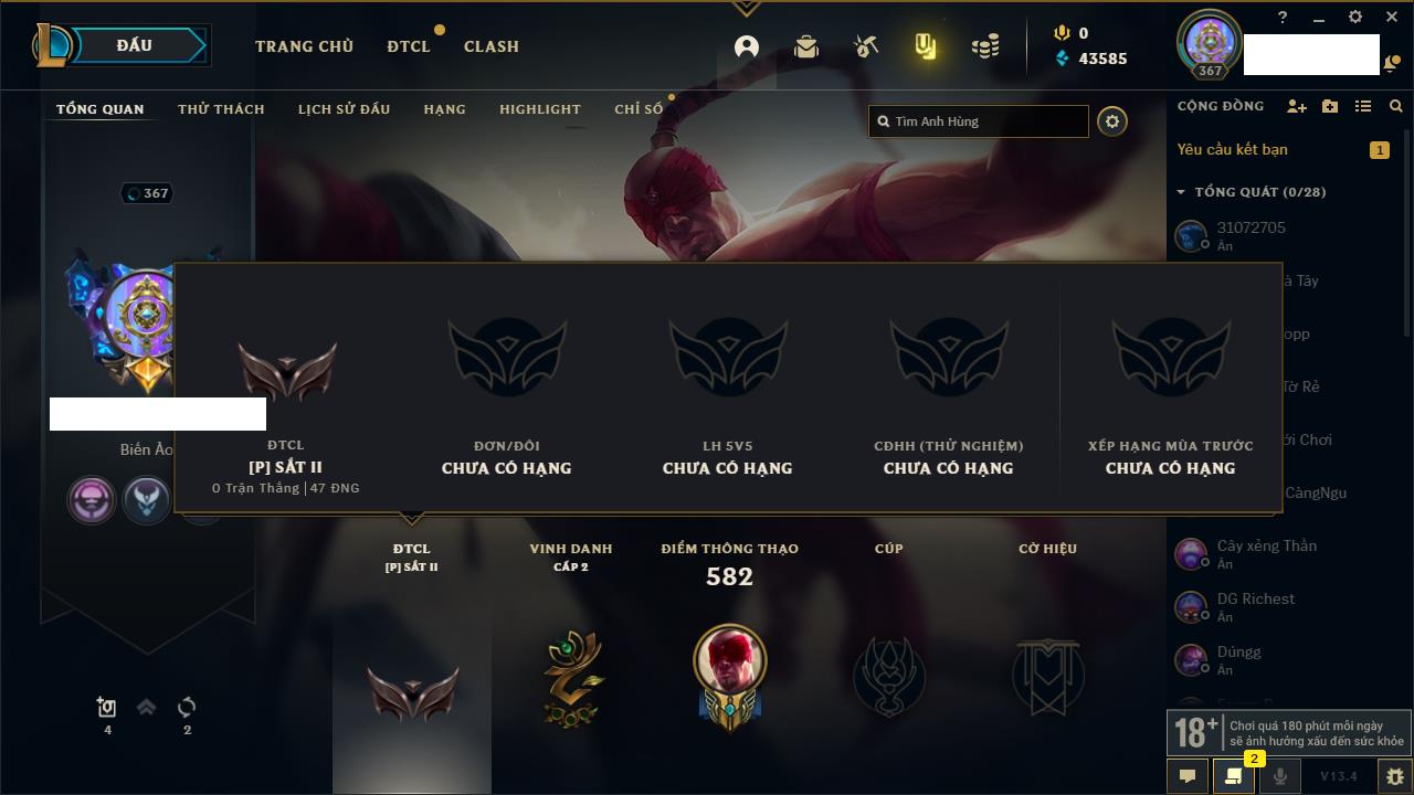 Rank Đơn: Vàng IKhung: BạcTướng: 171 - Còn 60584 THXTrang Phục: 286Rank ĐTCL: Vàng IIILinh Thú: 117