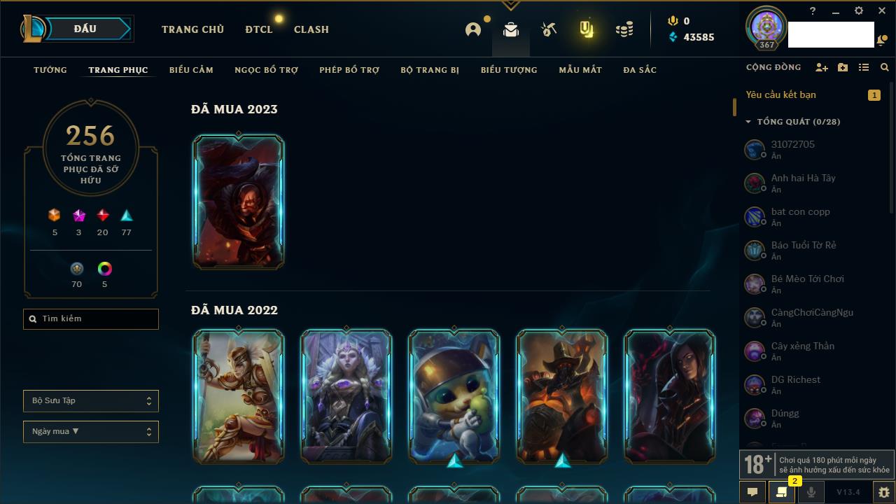 Rank Đơn: Vàng IIIKhung: VàngTướng: 171 - Còn 88128 THXTrang Phục: 329Rank ĐTCL: Chưa RankLinh Thú: 41