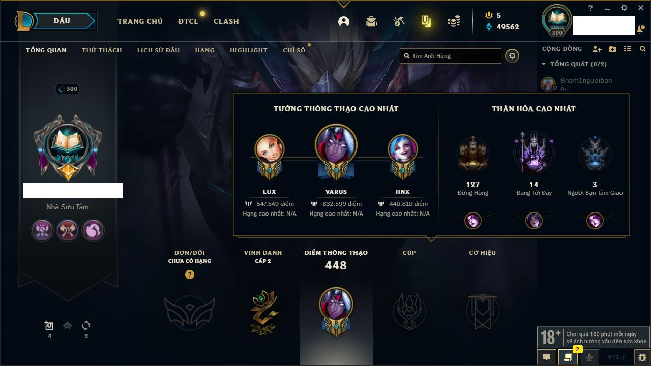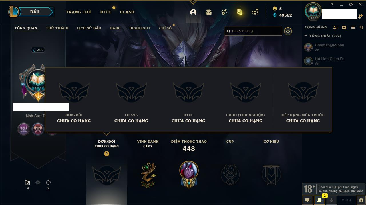 Rank Đơn: Chưa RankKhung: BạcTướng: 141 - Còn 299 THXTrang Phục: 101Rank ĐTCL: Chưa RankLinh Thú: 84