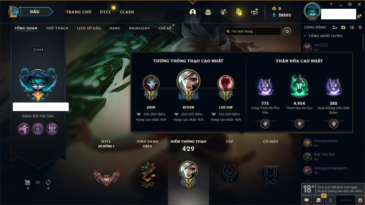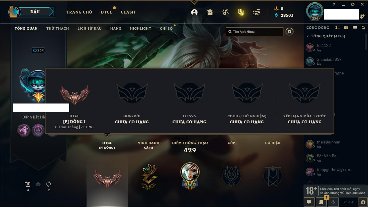 Rank Đơn: Sắt IKhung: SắtTướng: 171 - Còn 125789 THXTrang Phục: 151Rank ĐTCL: Đồng IIILinh Thú: 72
