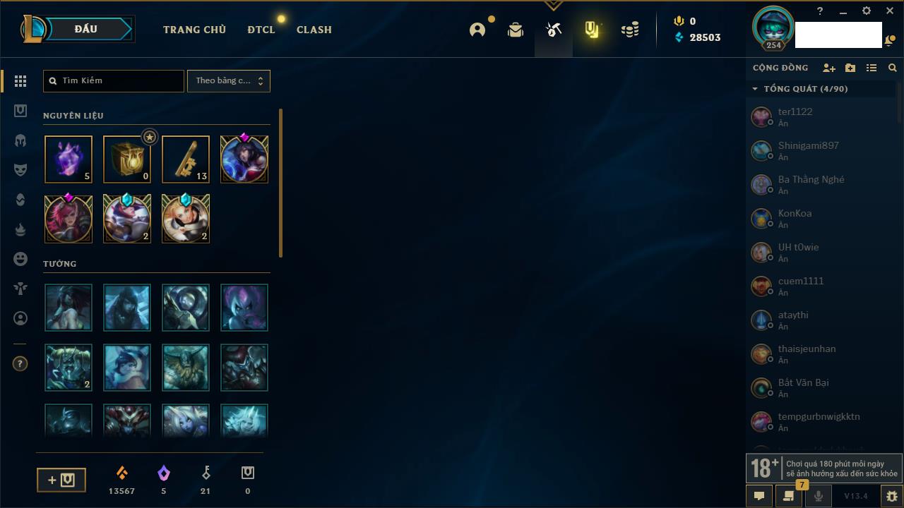 Rank Đơn: Bạc IVKhung: VàngTướng: 172 - Còn 358384 THXTrang Phục: 177Rank ĐTCL: Lục Bảo IILinh Thú: 211