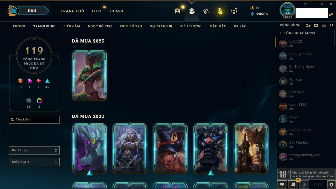 Rank Đơn: Vàng IVKhung: BạcTướng: 171 - Còn 426239 THXTrang Phục: 162Rank ĐTCL: Chưa RankLinh Thú: 33