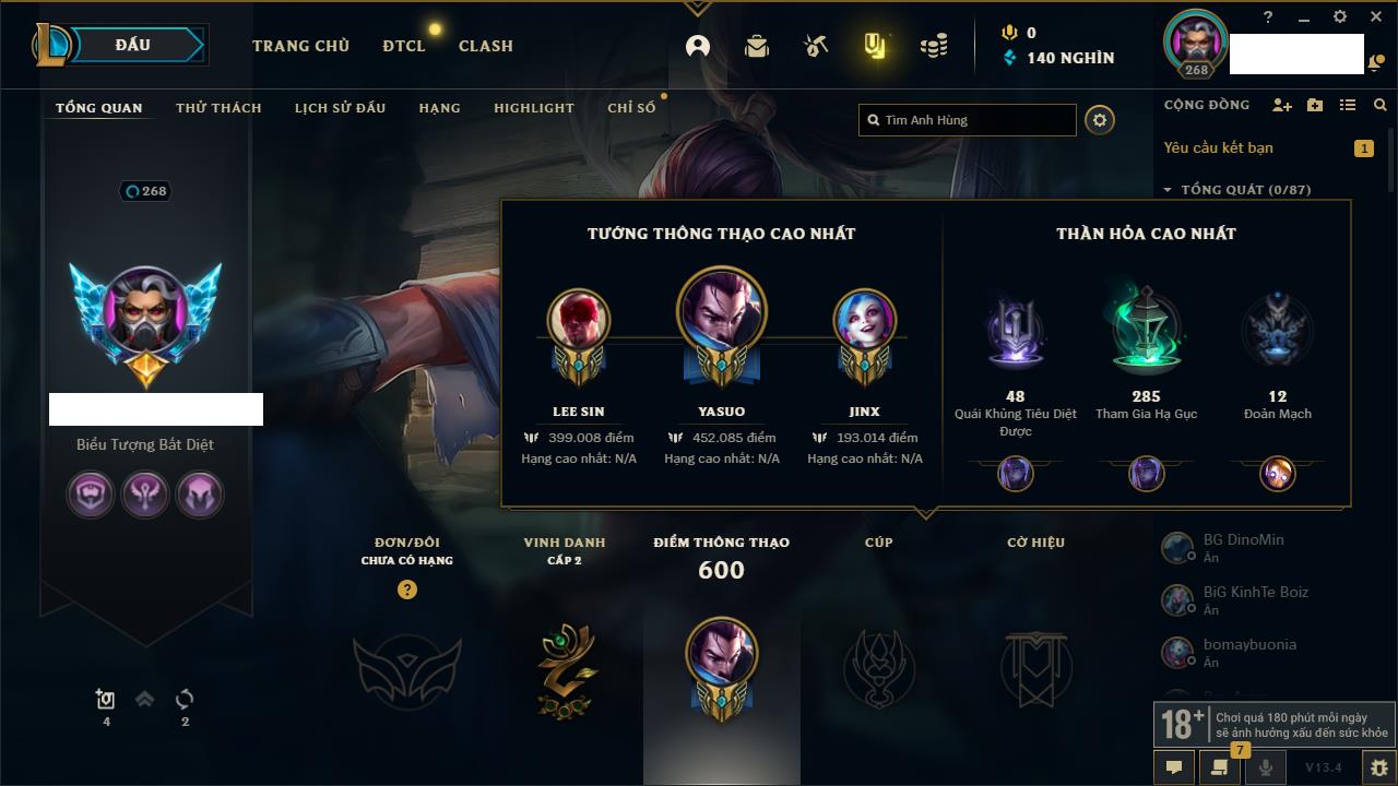 Rank Đơn: Đồng IKhung: ĐồngTướng: 168 - Còn 11447 THXTrang Phục: 245Rank ĐTCL: Chưa RankLinh Thú: 53