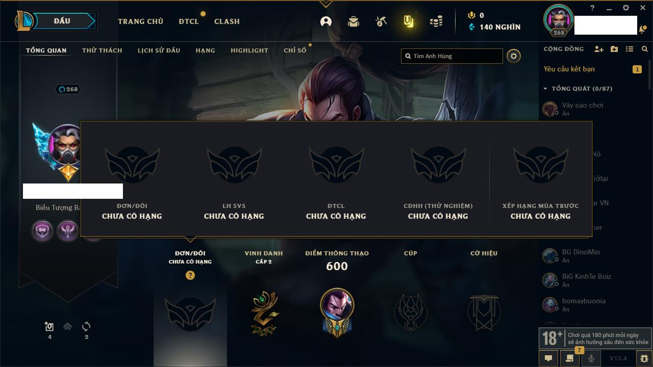 Rank Đơn: Vàng IIIKhung: BạcTướng: 171 - Còn 101359 THXTrang Phục: 88Rank ĐTCL: Kim Cương IVLinh Thú: 200