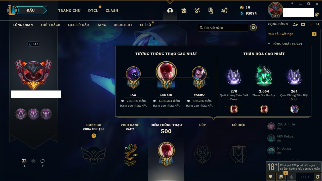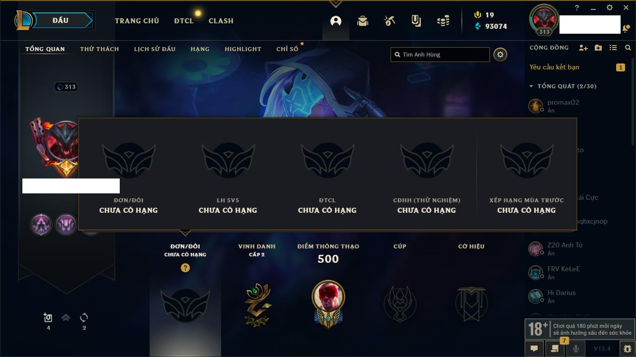 Rank Đơn: Sắt IKhung: SắtTướng: 171 - Còn 125789 THXTrang Phục: 151Rank ĐTCL: Đồng IIILinh Thú: 72