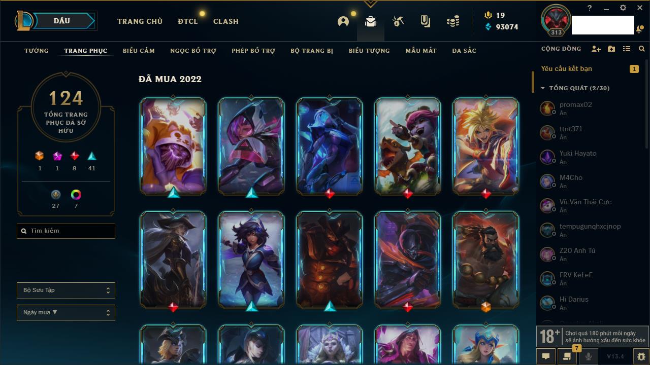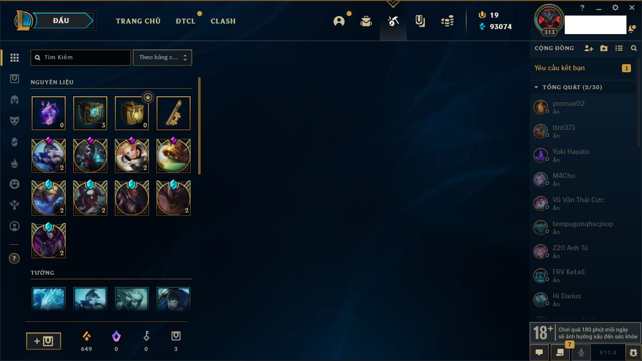 Rank Đơn: Vàng IVKhung: BạcTướng: 171 - Còn 426239 THXTrang Phục: 162Rank ĐTCL: Chưa RankLinh Thú: 33