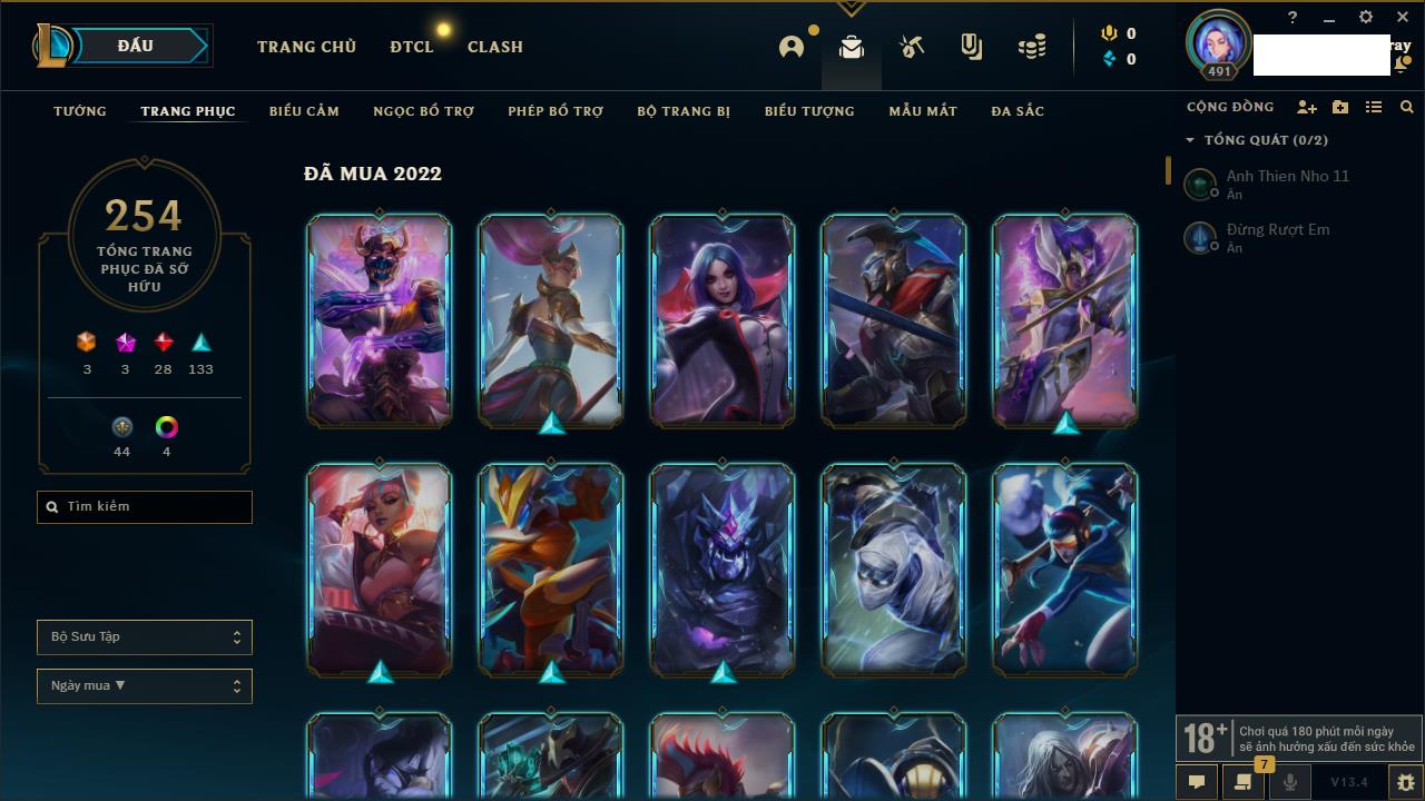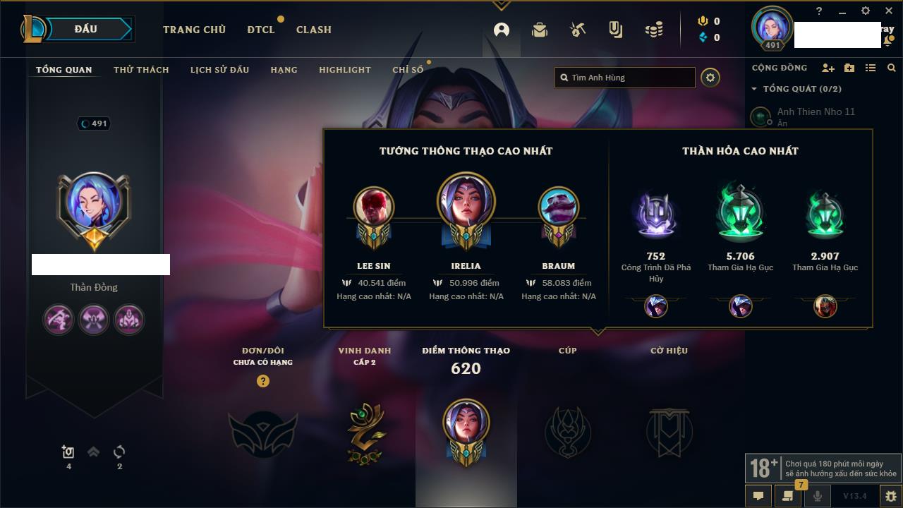 Rank Đơn: Bạch Kim IVKhung: VàngTướng: 170 - Còn 34137 THXTrang Phục: 209Rank ĐTCL: Chưa RankLinh Thú: 108
