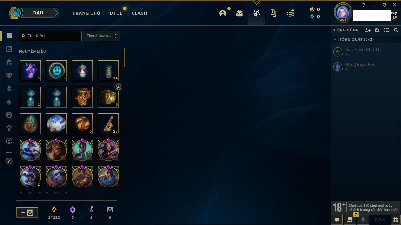 Rank Đơn: Vàng IIKhung: Bạch kimTướng: 172 - Còn 123420 THXTrang Phục: 231Rank ĐTCL: Bạch Kim IVLinh Thú: 213