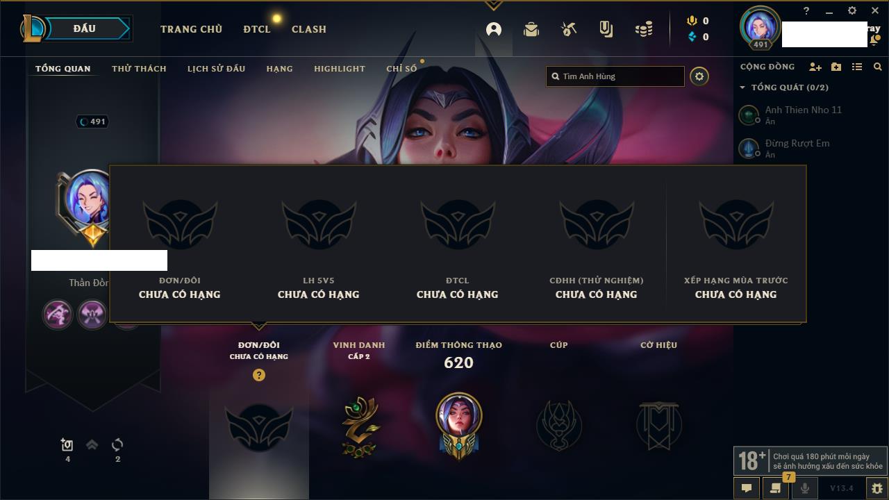 Rank Đơn: Đồng IIIKhung: ĐồngTướng: 171 - Còn 150319 THXTrang Phục: 245Rank ĐTCL: Chưa RankLinh Thú: 34
