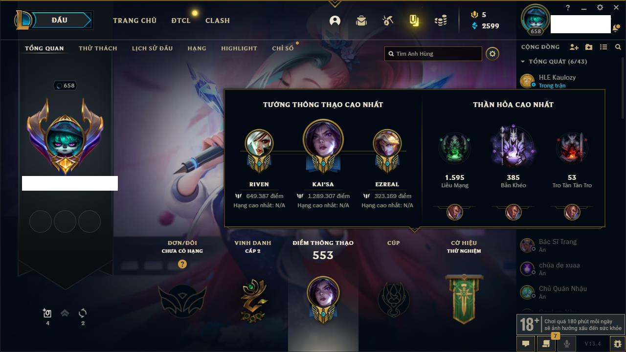Rank Đơn: Bạc IIIKhung: Chưa có khungTướng: 163 - Còn 66843 THXTrang Phục: 182Rank ĐTCL: Kim Cương IVLinh Thú: 114
