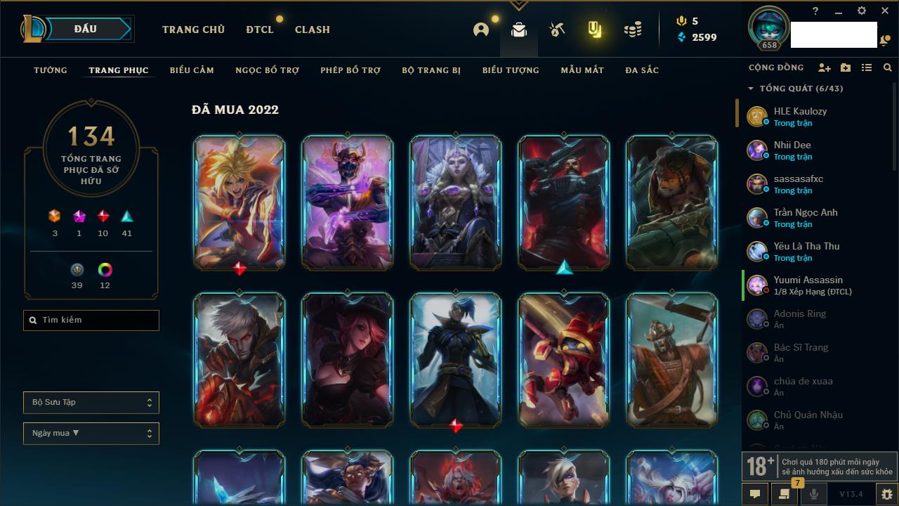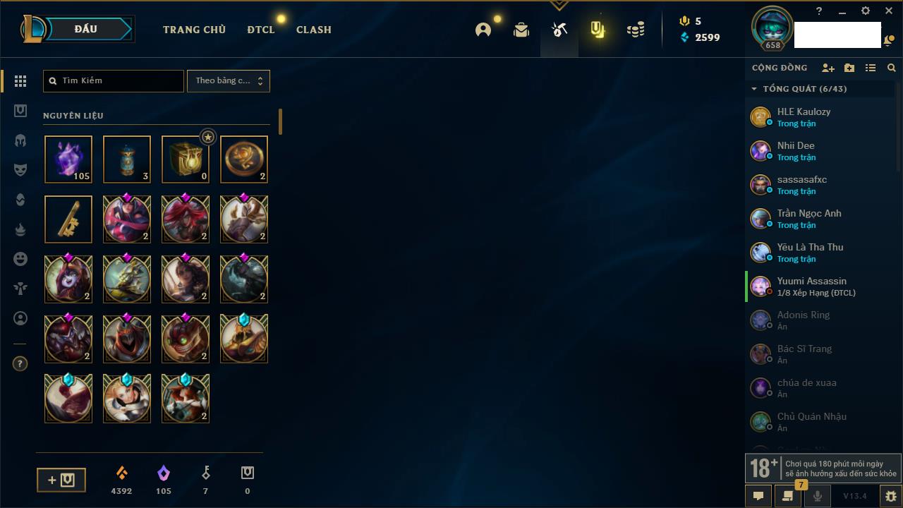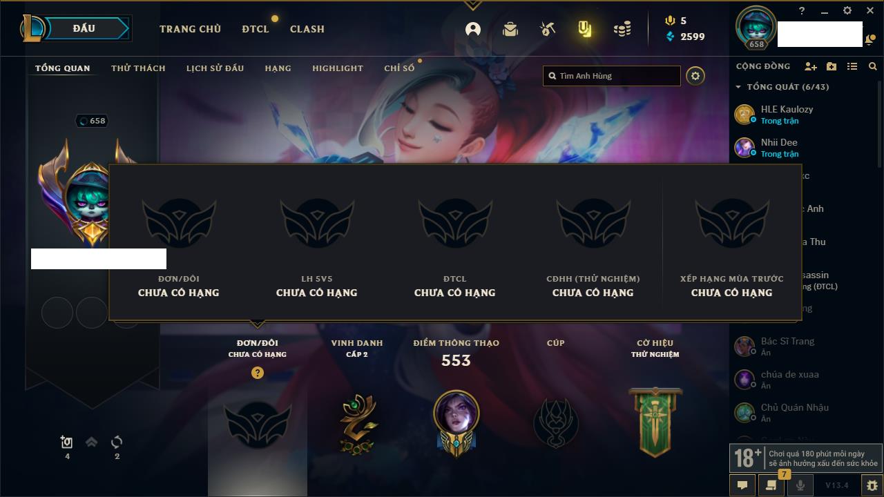 Rank Đơn: Vàng IIIKhung: BạcTướng: 171 - Còn 101359 THXTrang Phục: 88Rank ĐTCL: Kim Cương IVLinh Thú: 200