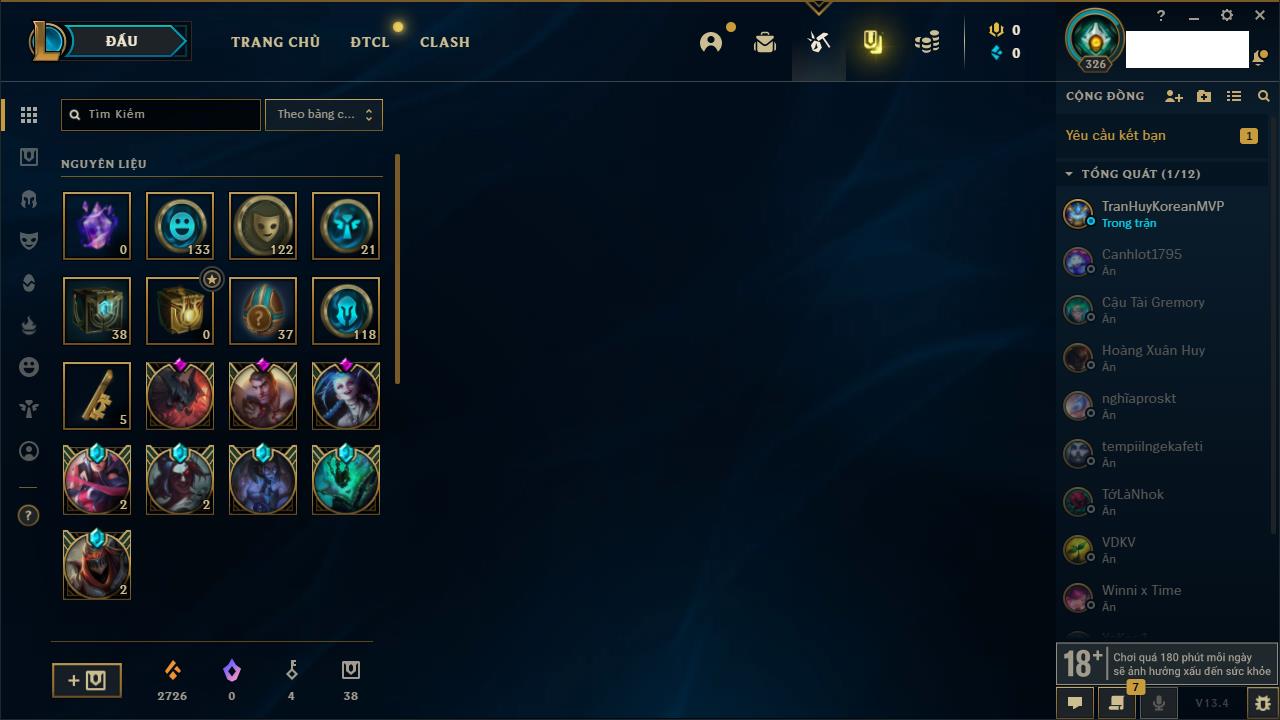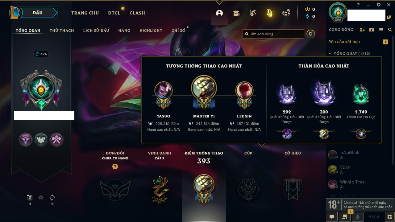 Rank Đơn: Chưa RankKhung: Chưa có khungTướng: 165 - Còn 3214 THXTrang Phục: 160Rank ĐTCL: Chưa RankLinh Thú: 28