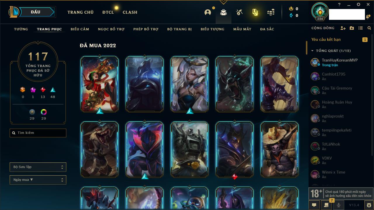 Rank Đơn: Chưa RankKhung: Chưa có khungTướng: 118 - Còn 13712 THXTrang Phục: 117Rank ĐTCL: Chưa RankLinh Thú: 34