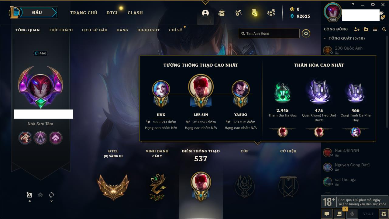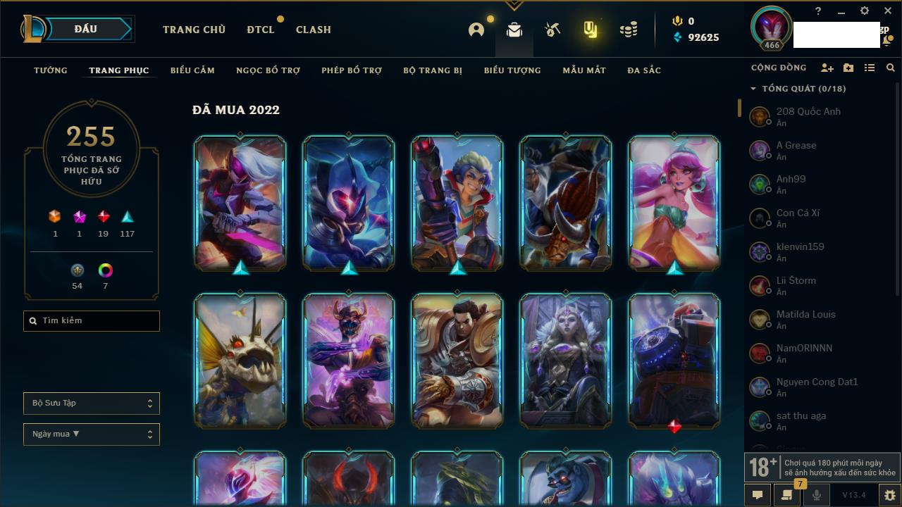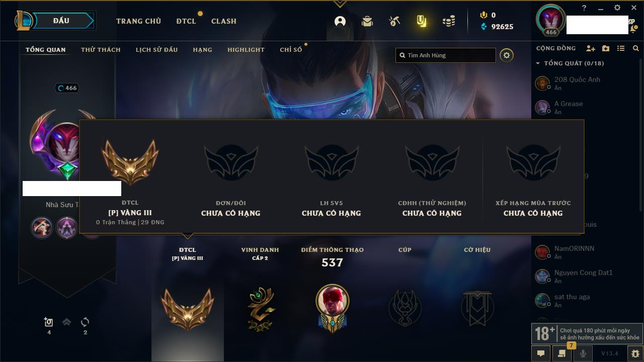 Rank Đơn: Bạc IIIKhung: BạcTướng: 171 - Còn 51045 THXTrang Phục: 220Rank ĐTCL: Sắt IILinh Thú: 141