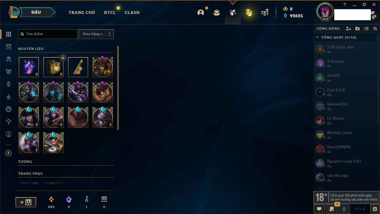 Rank Đơn: Vàng IVKhung: VàngTướng: 170 - Còn 84355 THXTrang Phục: 199Rank ĐTCL: Chưa RankLinh Thú: 116