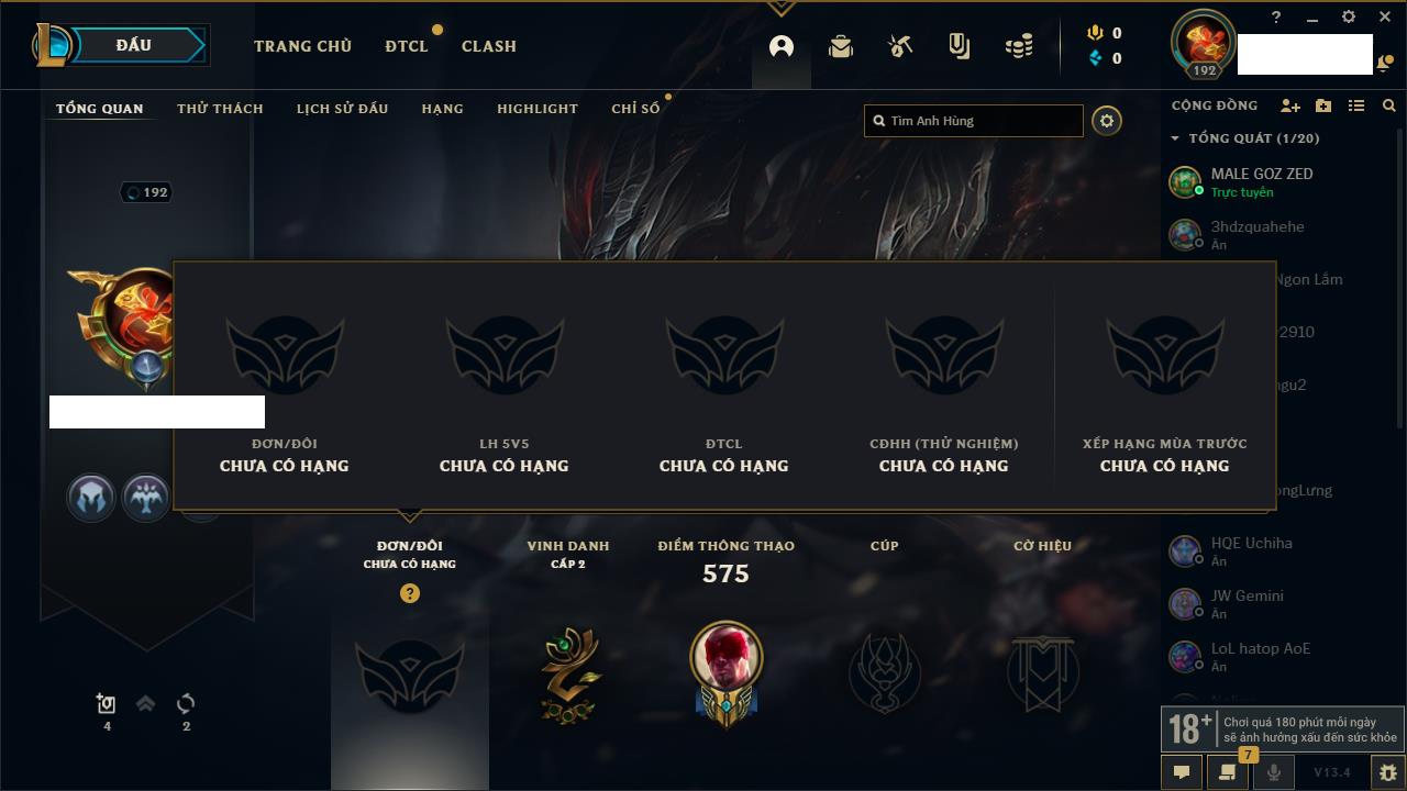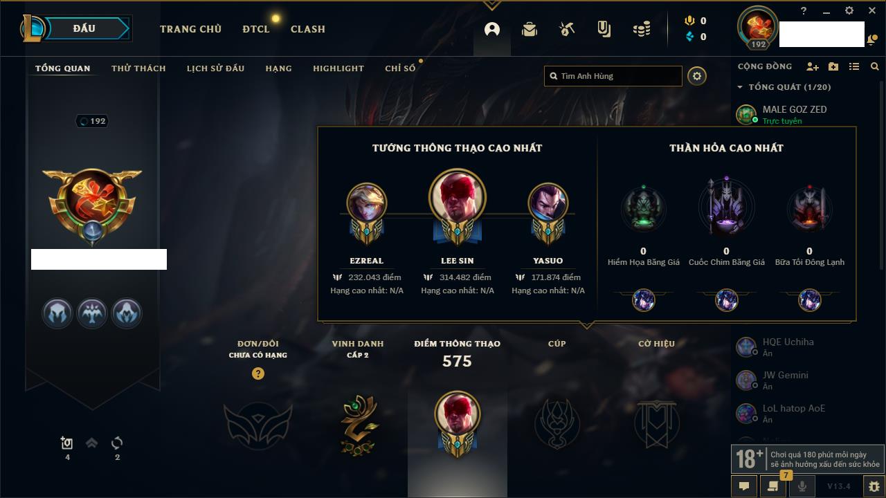 Rank Đơn: Bạch Kim IIKhung: Bạch kimTướng: 171 - Còn 316137 THXTrang Phục: 89Rank ĐTCL: Bạch Kim IIILinh Thú: 94