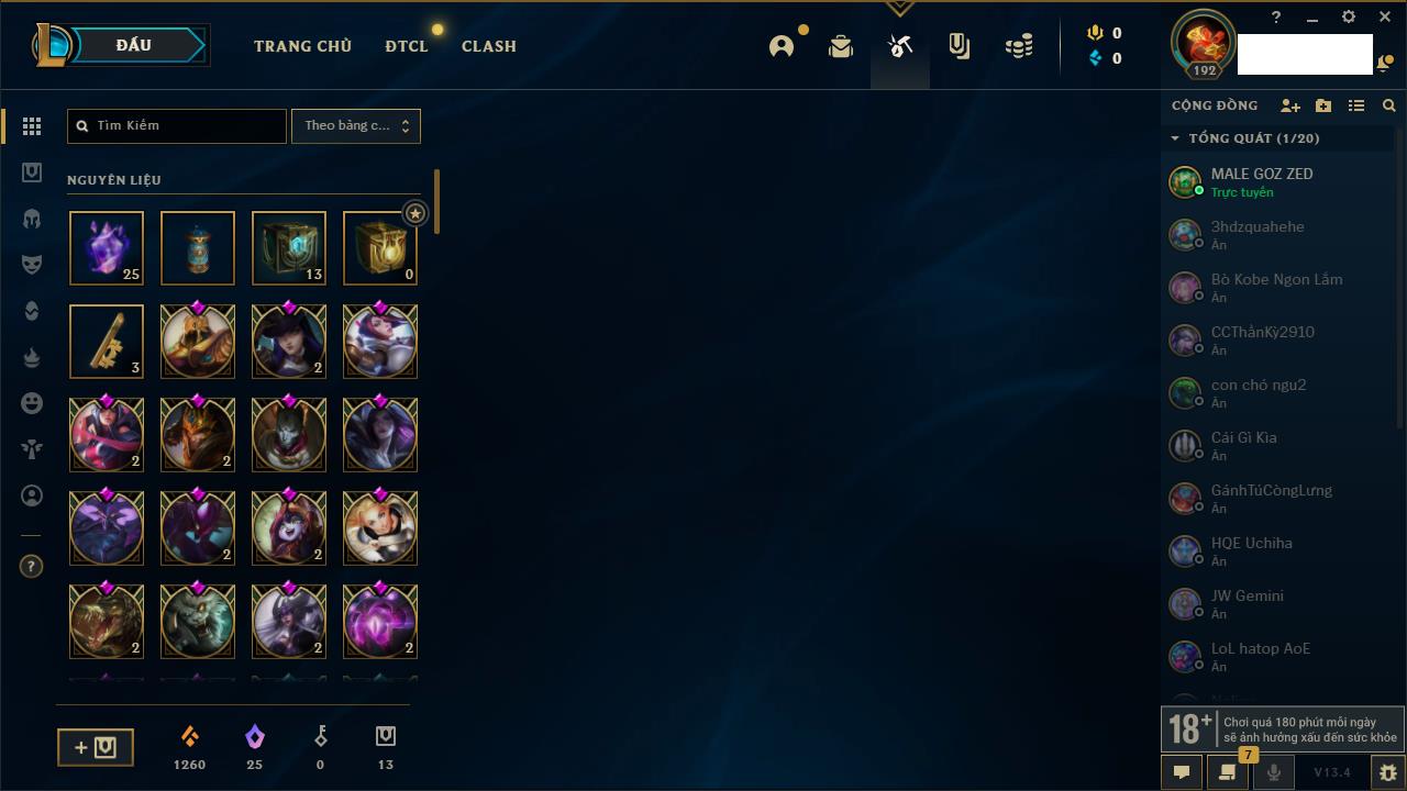 Rank Đơn: Bạc IIIKhung: BạcTướng: 171 - Còn 190352 THXTrang Phục: 260Rank ĐTCL: Sắt IILinh Thú: 31