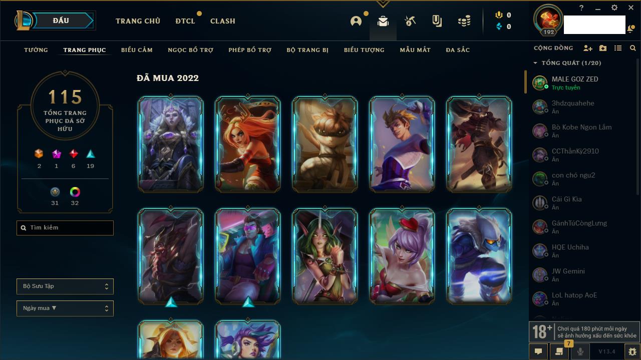 Rank Đơn: Bạch Kim IIKhung: Bạch kimTướng: 171 - Còn 315217 THXTrang Phục: 238Rank ĐTCL: Bạch Kim ILinh Thú: 116