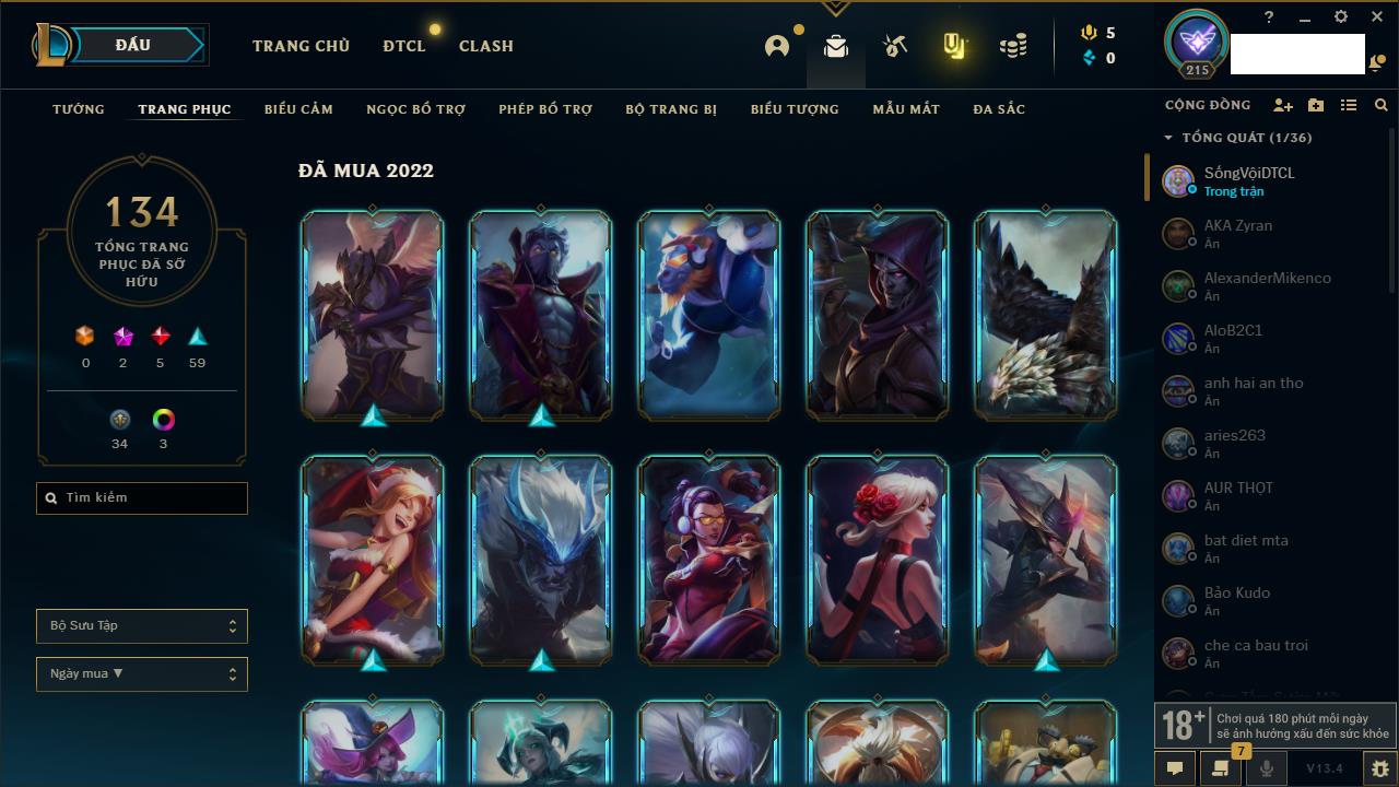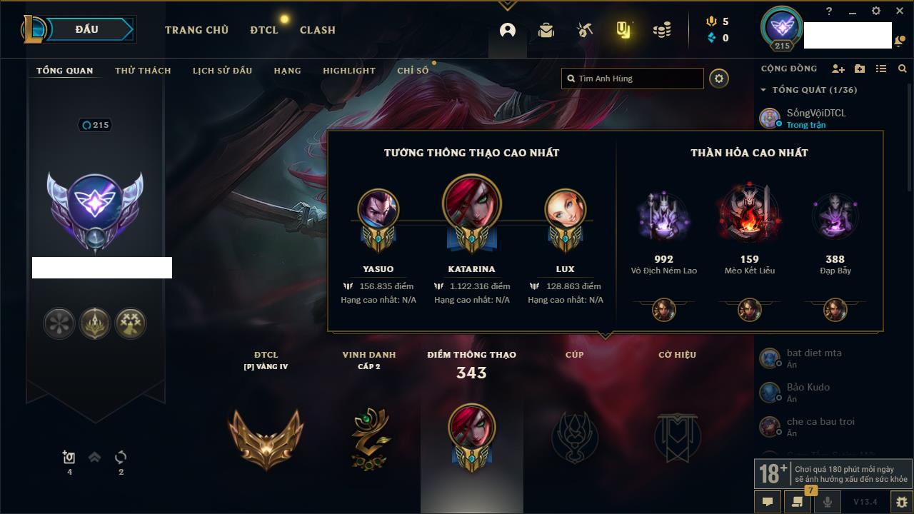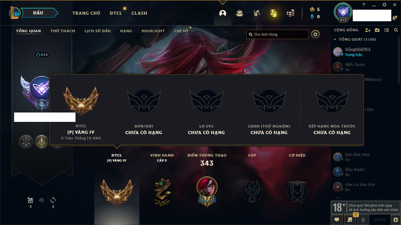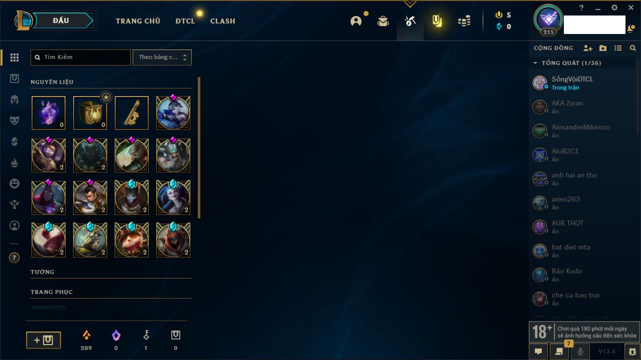 Rank Đơn: Vàng IVKhung: BạcTướng: 171 - Còn 231097 THXTrang Phục: 180Rank ĐTCL: Vàng IVLinh Thú: 110
