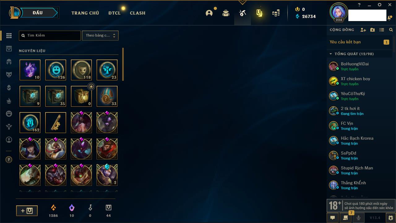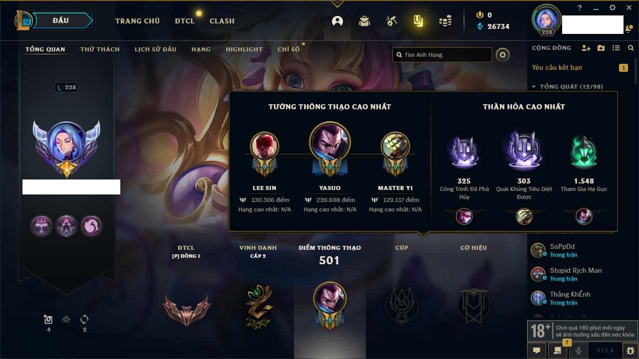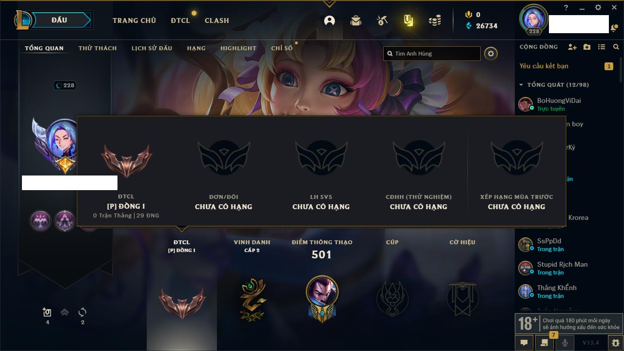Rank Đơn: Đồng IIKhung: Chưa có khungTướng: 170 - Còn 56487 THXTrang Phục: 90Rank ĐTCL: Chưa RankLinh Thú: 129