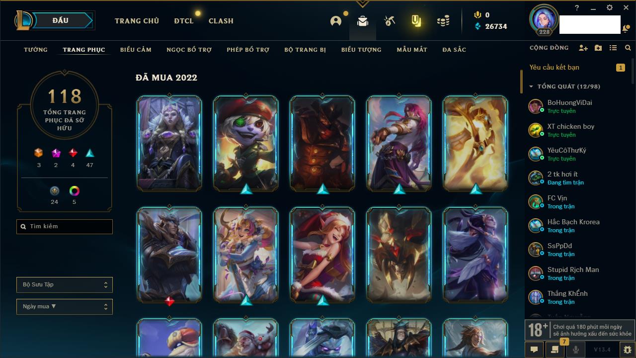 Rank Đơn: Vàng IIIKhung: VàngTướng: 170 - Còn 33222 THXTrang Phục: 136Rank ĐTCL: Chưa RankLinh Thú: 40