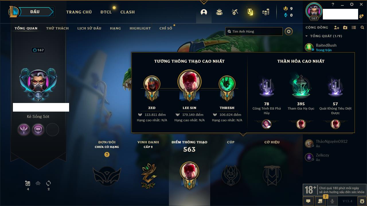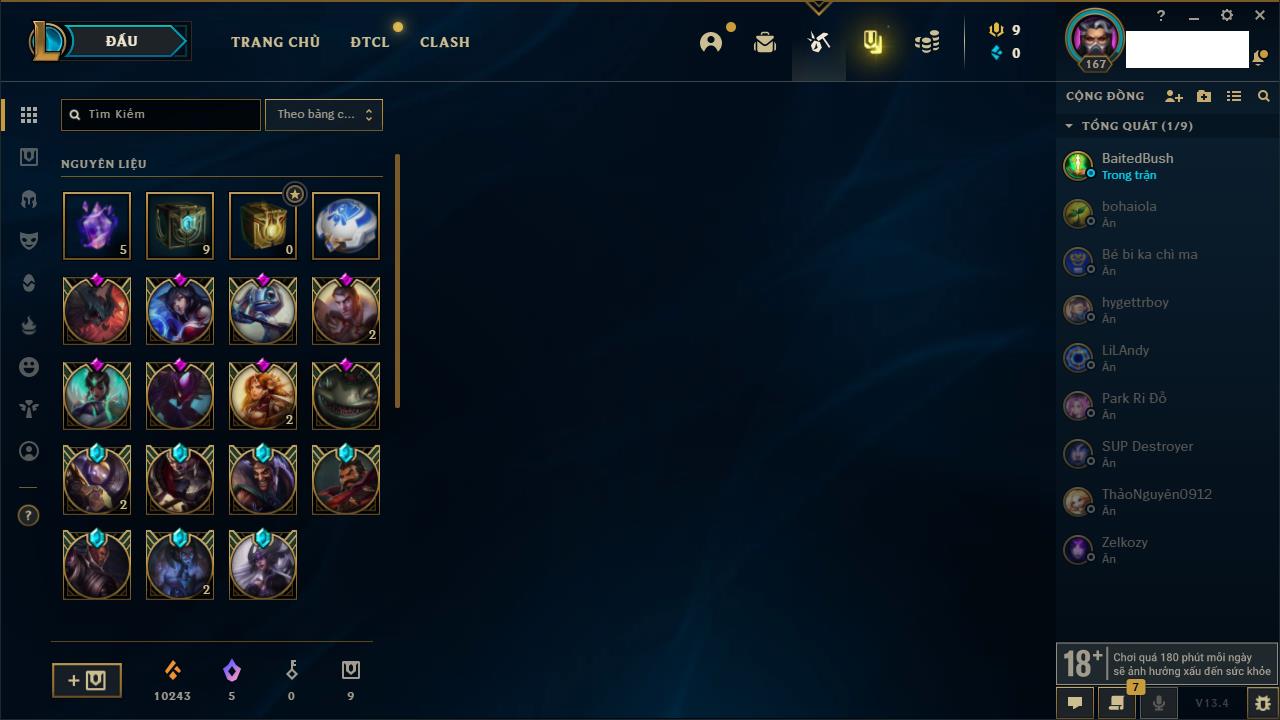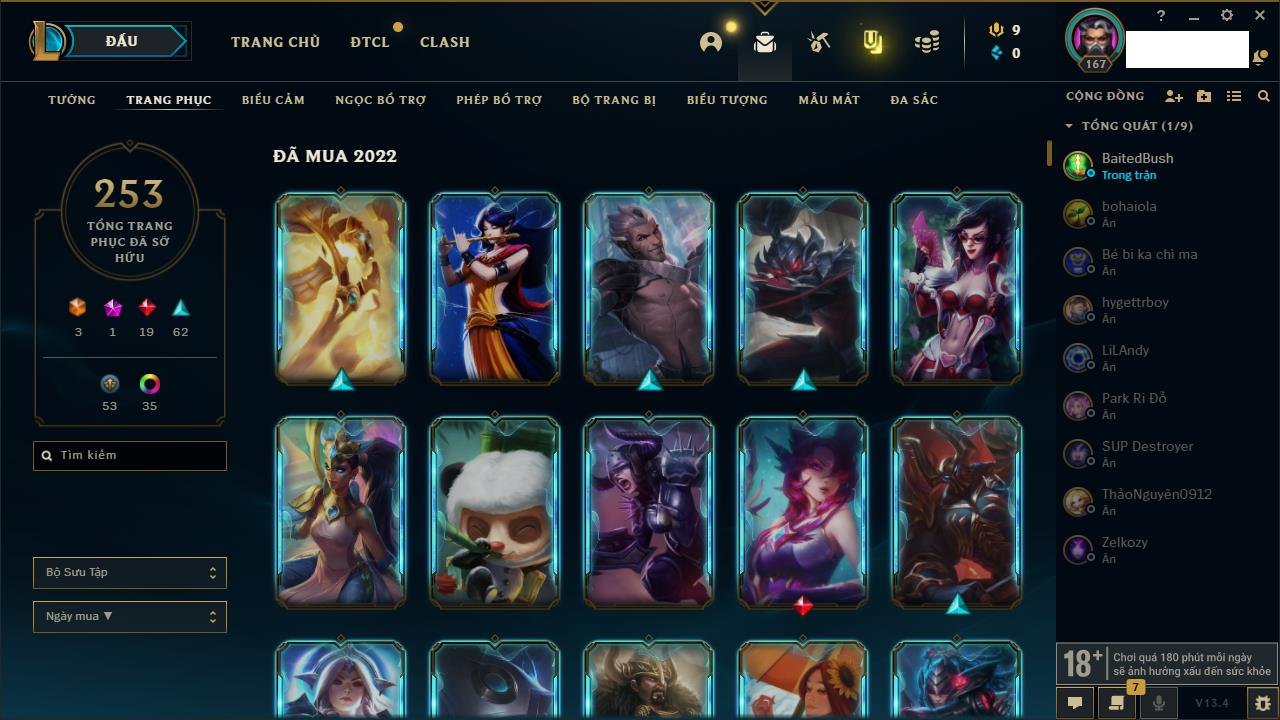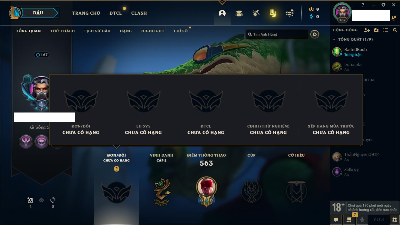 Rank Đơn: Vàng IIIKhung: BạcTướng: 171 - Còn 101359 THXTrang Phục: 88Rank ĐTCL: Kim Cương IVLinh Thú: 200