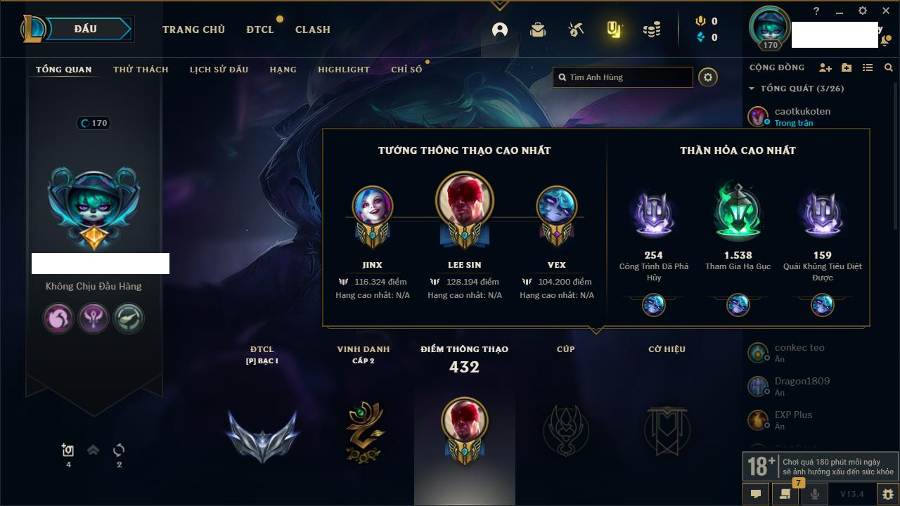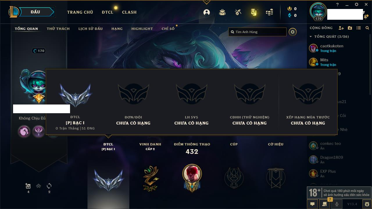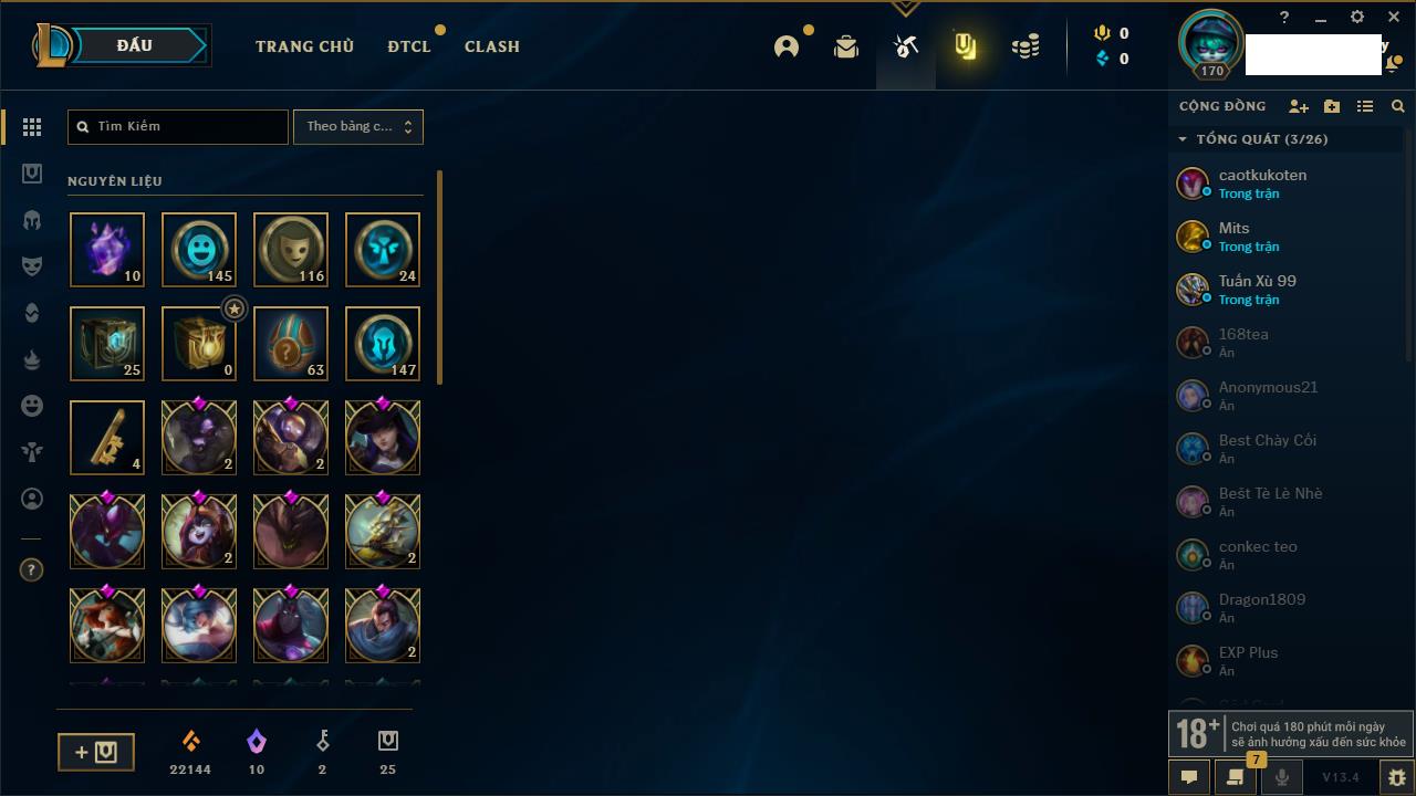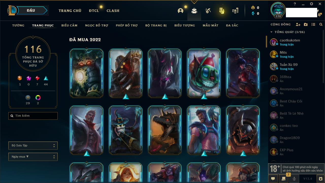 Rank Đơn: Đồng IIKhung: Chưa có khungTướng: 170 - Còn 56487 THXTrang Phục: 90Rank ĐTCL: Chưa RankLinh Thú: 129