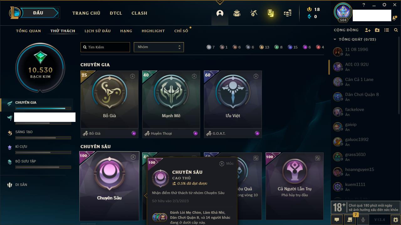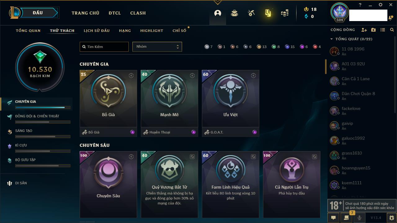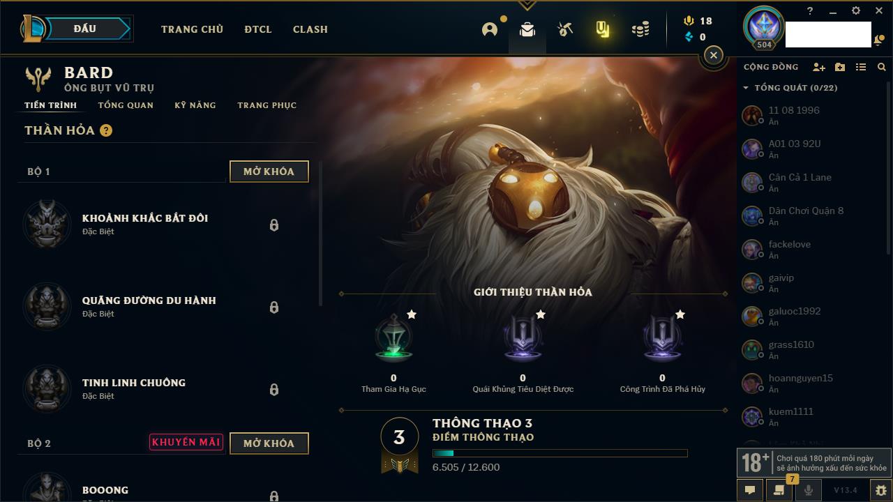 Rank Đơn: Đồng IIKhung: Chưa có khungTướng: 170 - Còn 56487 THXTrang Phục: 90Rank ĐTCL: Chưa RankLinh Thú: 129