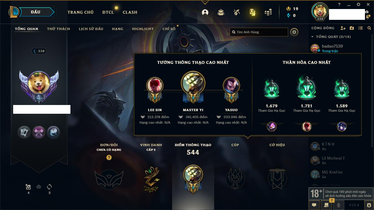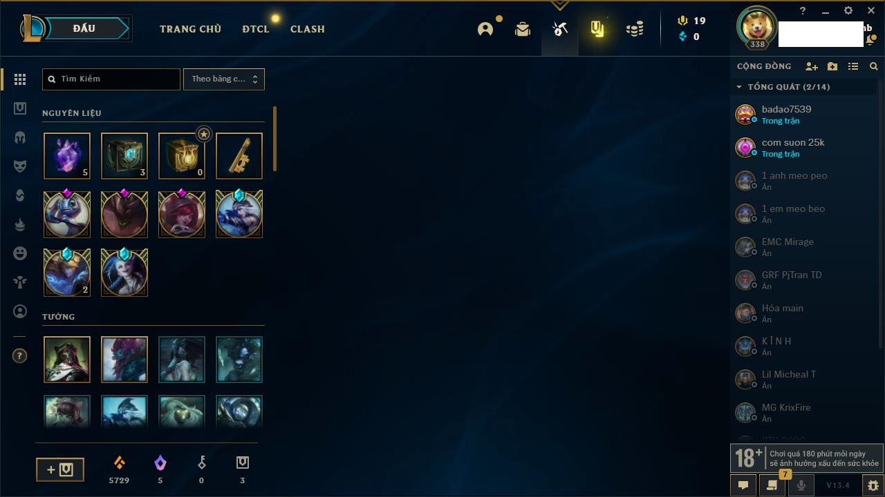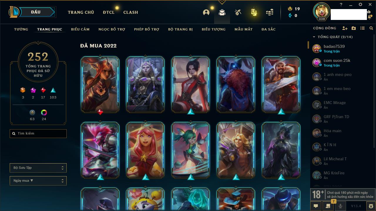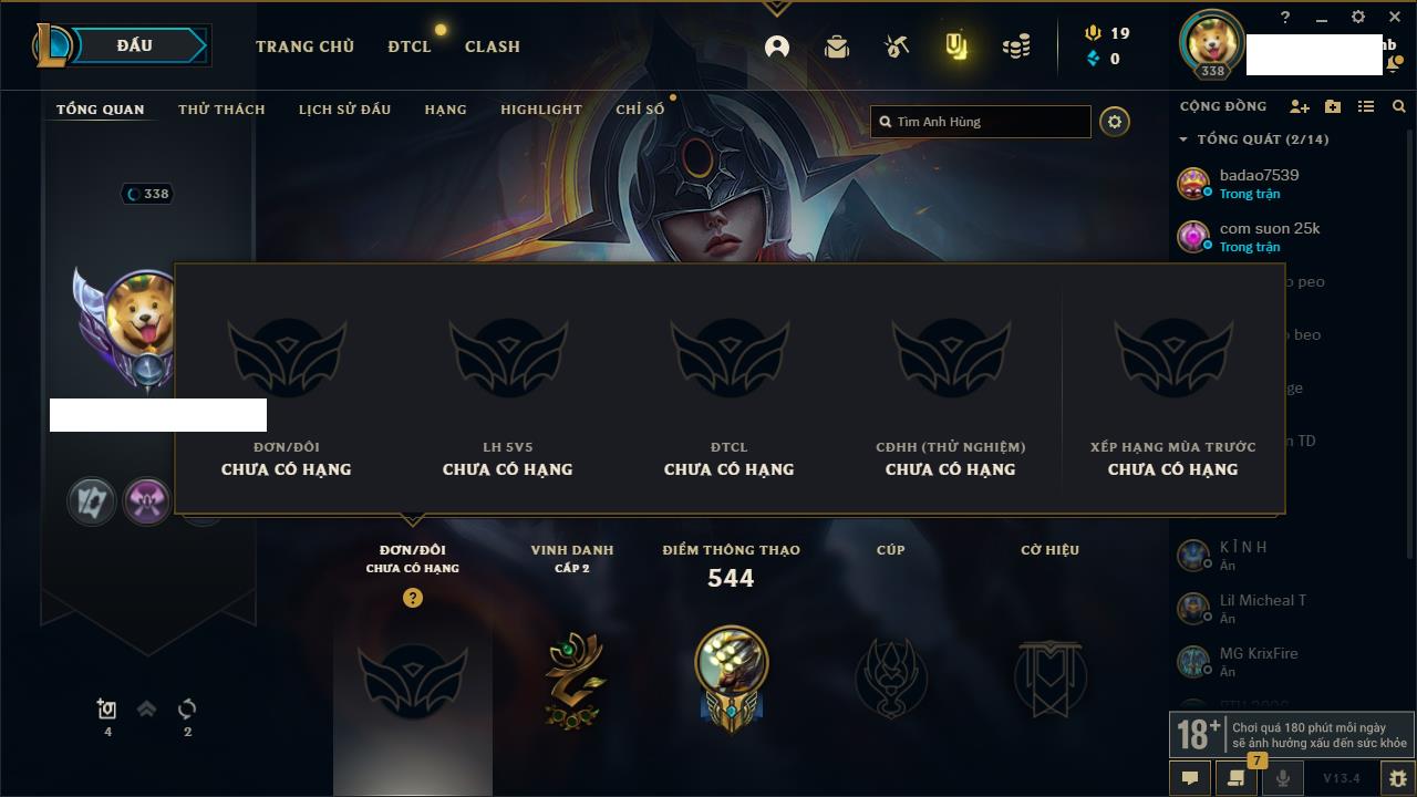 Rank Đơn: Bạc IIIKhung: BạcTướng: 171 - Còn 51045 THXTrang Phục: 220Rank ĐTCL: Sắt IILinh Thú: 141