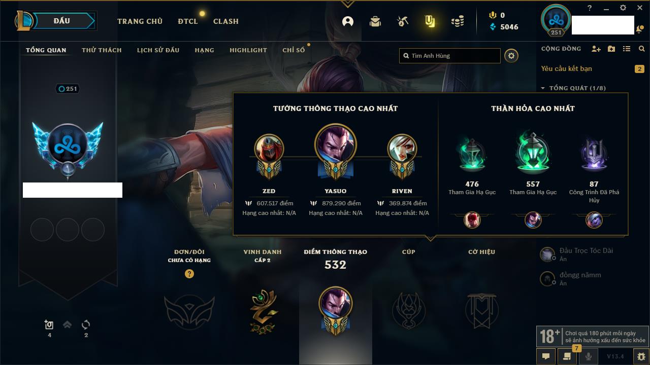 Rank Đơn: Chưa RankKhung: BạcTướng: 141 - Còn 299 THXTrang Phục: 101Rank ĐTCL: Chưa RankLinh Thú: 84