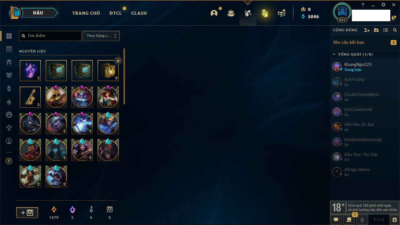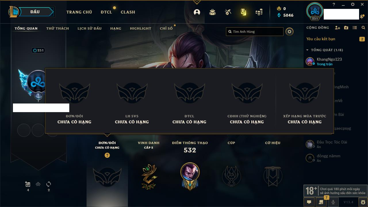 Rank Đơn: Chưa RankKhung: Chưa có khungTướng: 162 - Còn 23234 THXTrang Phục: 150Rank ĐTCL: Chưa RankLinh Thú: 42