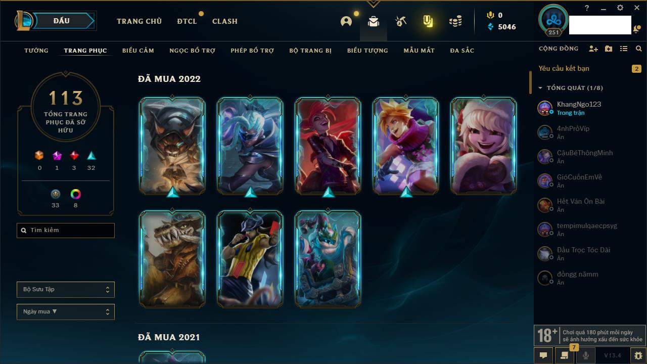 Rank Đơn: Chưa RankKhung: Chưa có khungTướng: 163 - Còn 157403 THXTrang Phục: 149Rank ĐTCL: Chưa RankLinh Thú: 122