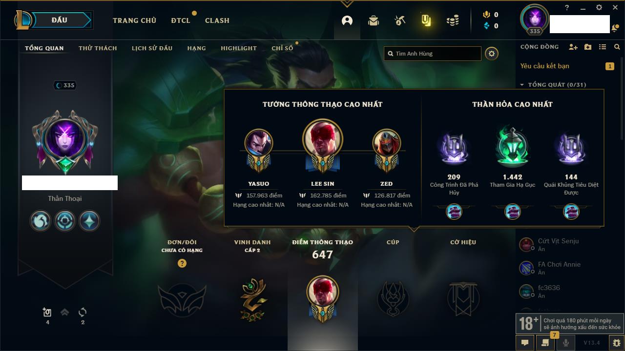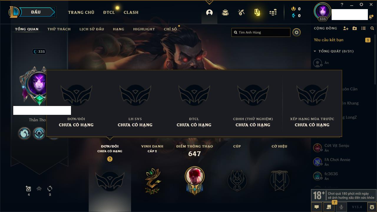 Rank Đơn: Vàng IKhung: BạcTướng: 171 - Còn 60584 THXTrang Phục: 286Rank ĐTCL: Vàng IIILinh Thú: 117