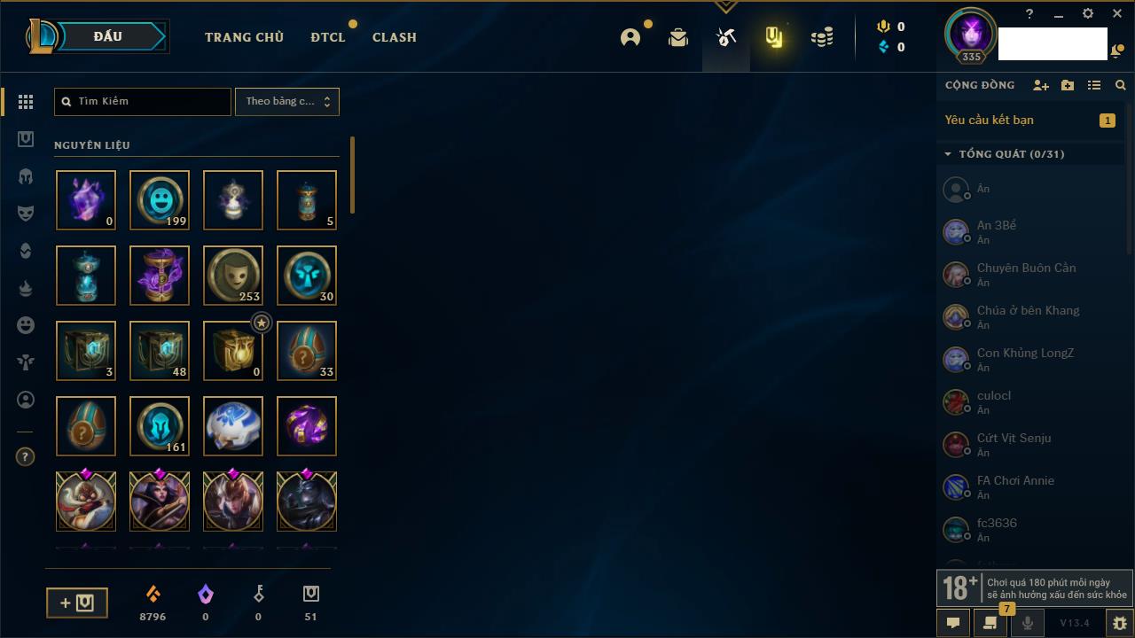 Rank Đơn: Bạch Kim IIIKhung: Bạch kimTướng: 171 - Còn 251383 THXTrang Phục: 229Rank ĐTCL: Sắt IILinh Thú: 51