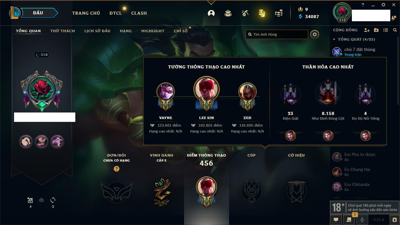 Rank Đơn: Bạch Kim IIKhung: VàngTướng: 171 - Còn 140736 THXTrang Phục: 182Rank ĐTCL: Chưa RankLinh Thú: 14