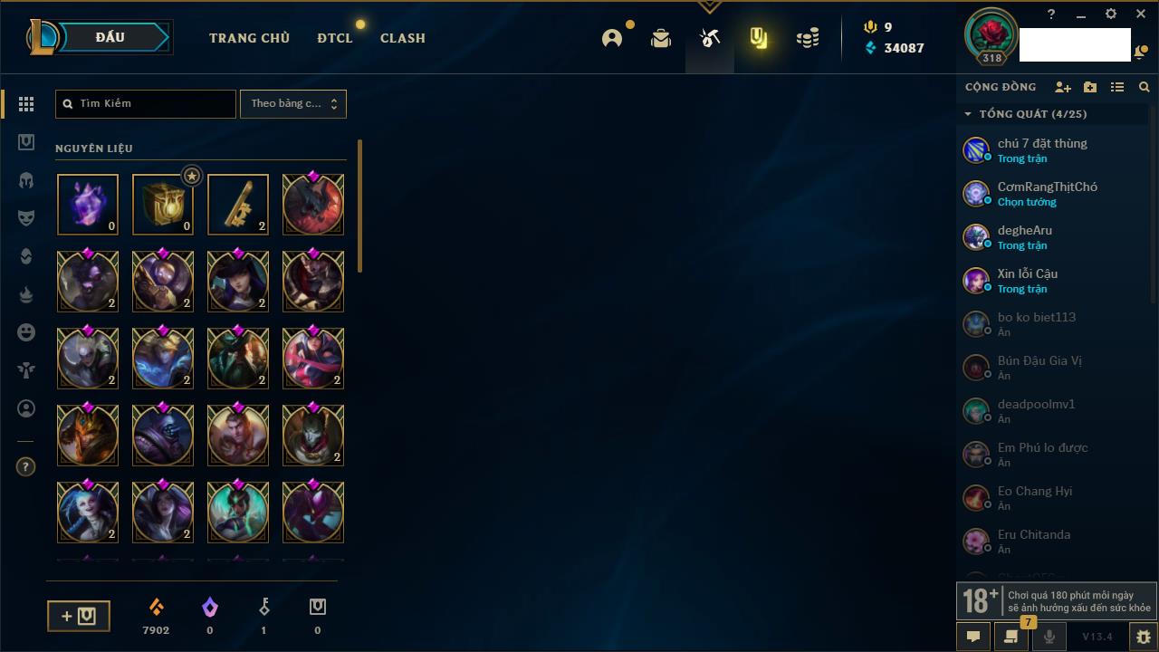 Rank Đơn: Vàng IVKhung: VàngTướng: 170 - Còn 84355 THXTrang Phục: 199Rank ĐTCL: Chưa RankLinh Thú: 116