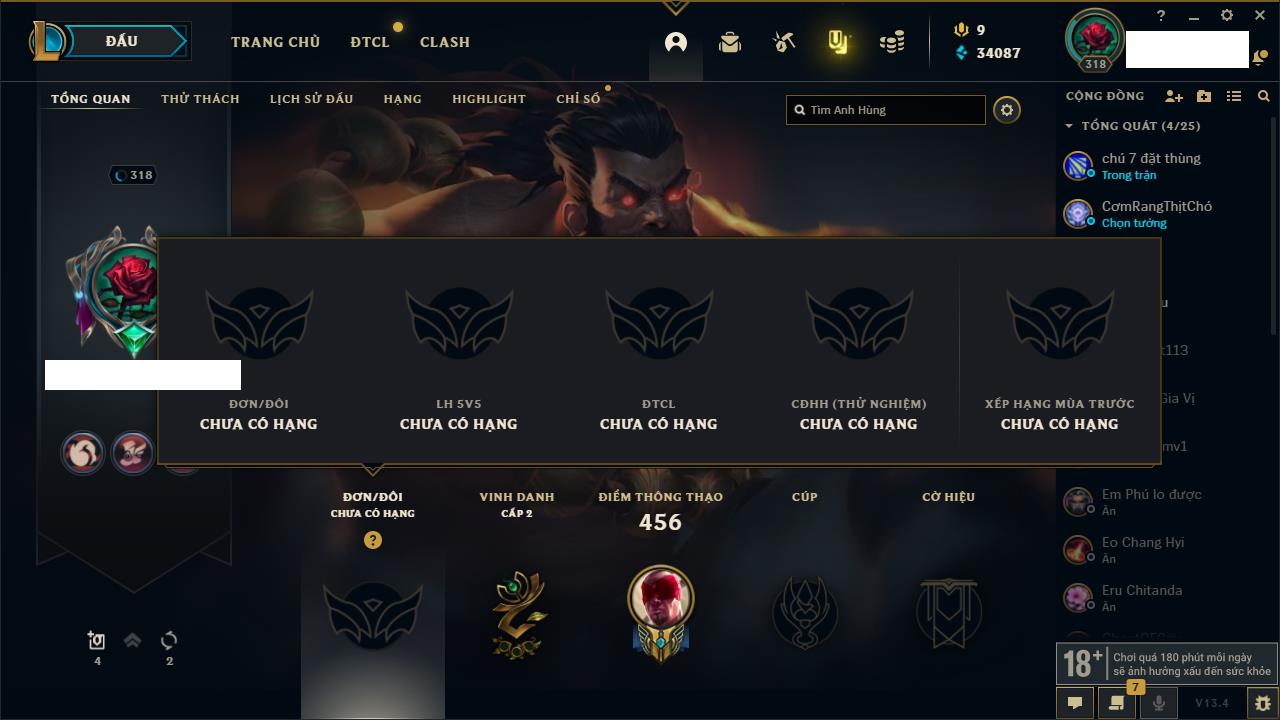 Rank Đơn: Bạc IIIKhung: BạcTướng: 171 - Còn 51045 THXTrang Phục: 220Rank ĐTCL: Sắt IILinh Thú: 141