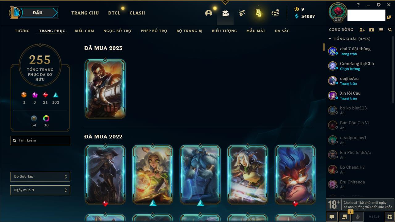 Rank Đơn: Vàng IKhung: VàngTướng: 171 - Còn 117995 THXTrang Phục: 199Rank ĐTCL: Lục Bảo IILinh Thú: 74